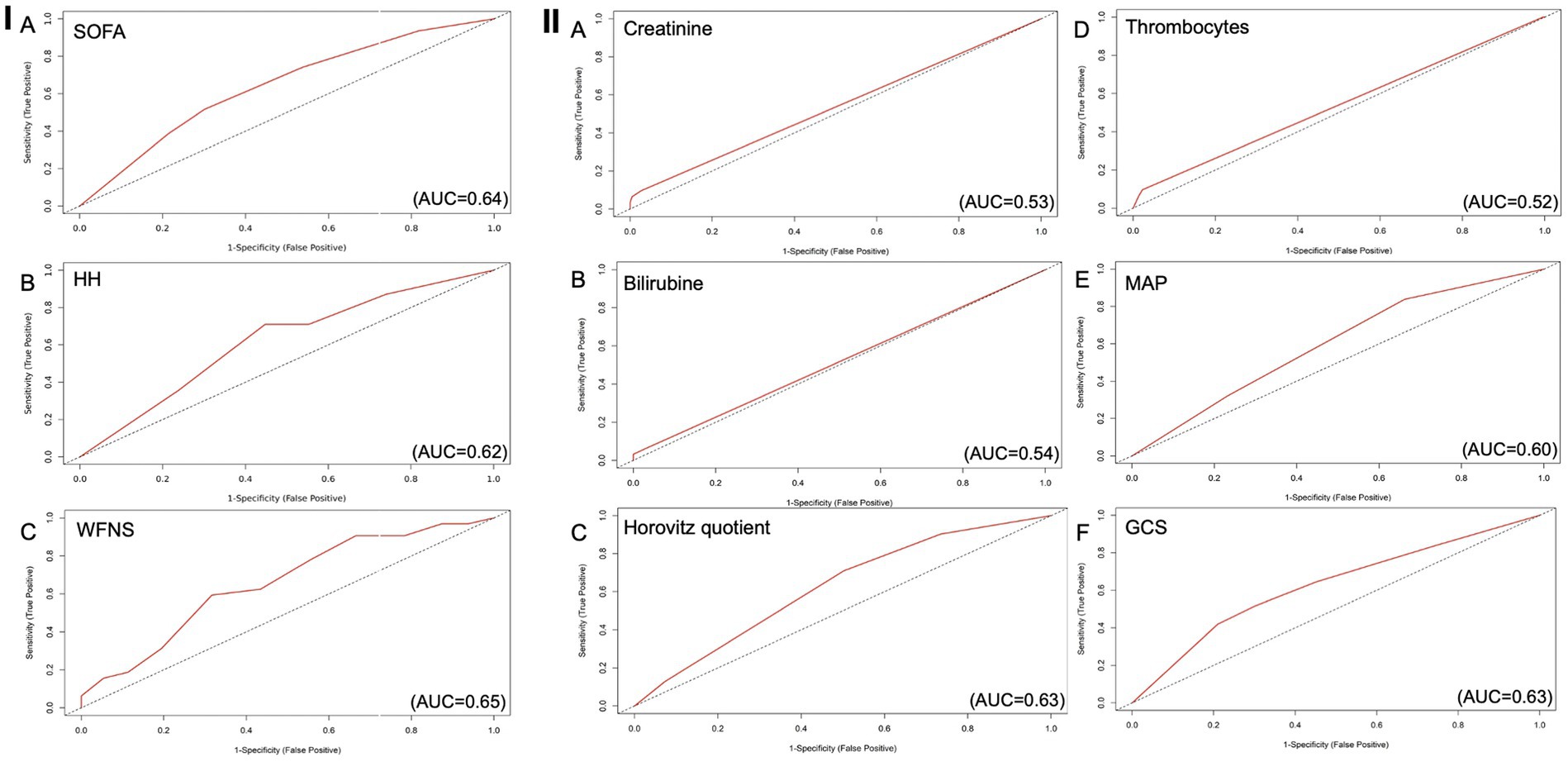 In the next step, we checked every parameter of the SOFA score for its predictive value. The most valuable parameters analyzed on their own with regard to their discriminatory value (AUC) were the GCS (AUC = 0.63, sensitivity = 0.42, specificity = 0.79, PPV = 0.22, NPV = 0.91) with the Youden index of 0.21 and the Horovitz quotient (AUC = 0.63, sensitivity = 0.71, specificity = 0.50, PPV = 0.17, NPV = 0.92) with the Youden index of 0.21. The last parameter with the third highest AUC was the MAP (AUC = 0.60, sensitivity = 0.84, specificity = 0.34, PPV = 0.15, NPV = 0.94) (Figures II 3A–F).