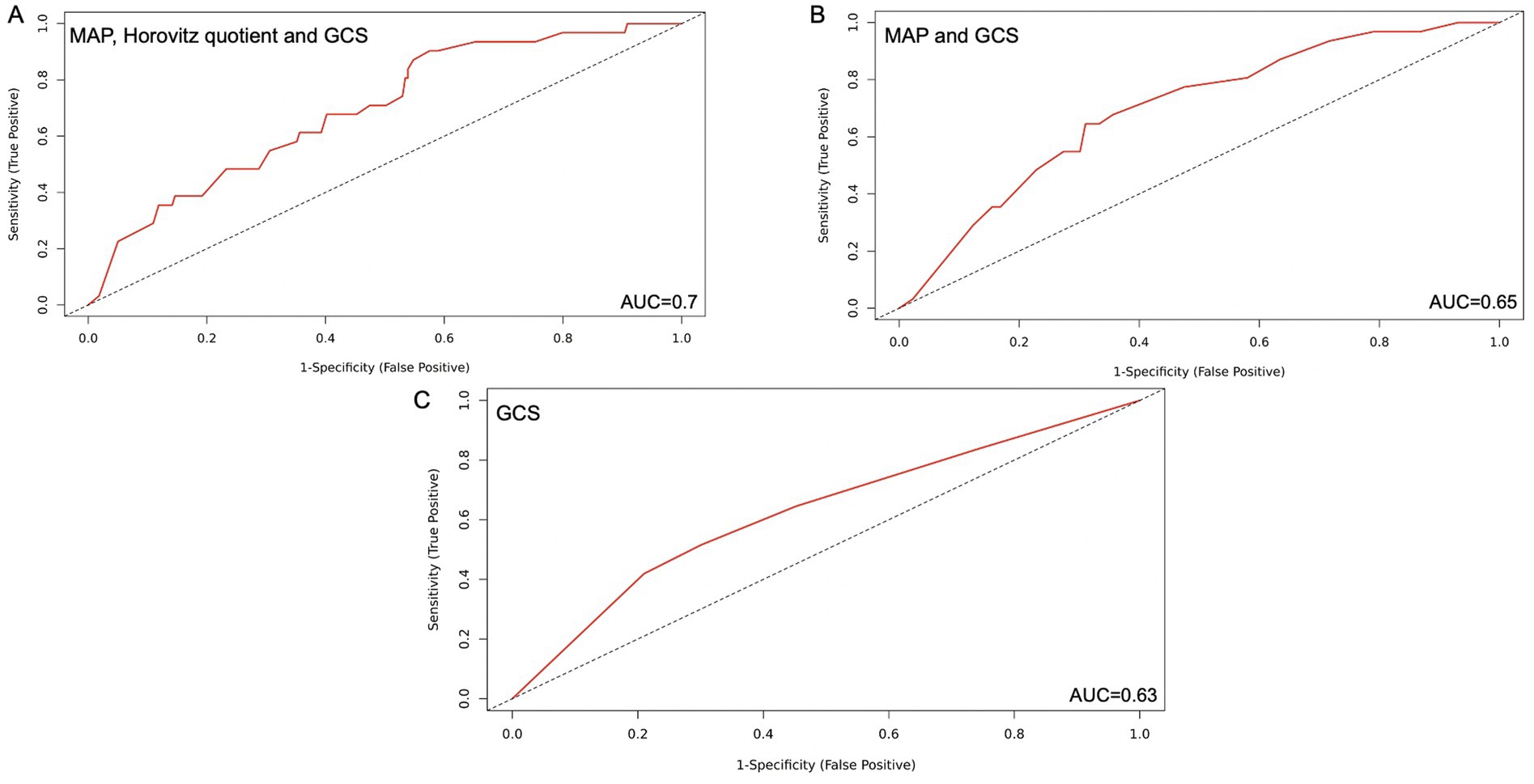 Figure 3. Simplified SOFA score with 1,2 and 3 parameters respectively with the highest predictive value for DCI-associated infarctions after SAH. (A) MAP, Horovitz quotient and GCS included, AUC=0.70 (B) MAP and GCS, AUC=0.65 (C) GCS alone, AUC=0.63. AUC: Area under the curve; GCS: Glasgow Coma Scale; MAP: Mean Arterial Pressure; SAH: Subarachnoidal hemorrhage; SOFA; Sequential Organ Failure Assessment Score.