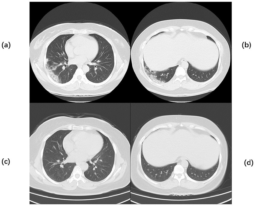 Chest CT of Case 2. Computed tomography (CT) of the chest before the start of treatment (a,b) large, patchy high-density foci under the pleura of the right lung with blurred margins and uneven density. Chest CT after 2 months of continuous treatment (c,d) Flocculent and patchy slightly high-density foci were seen under the pleura of the lower lobe of the right lung, with fuzzy edges and uneven densities, which were significantly better than before.