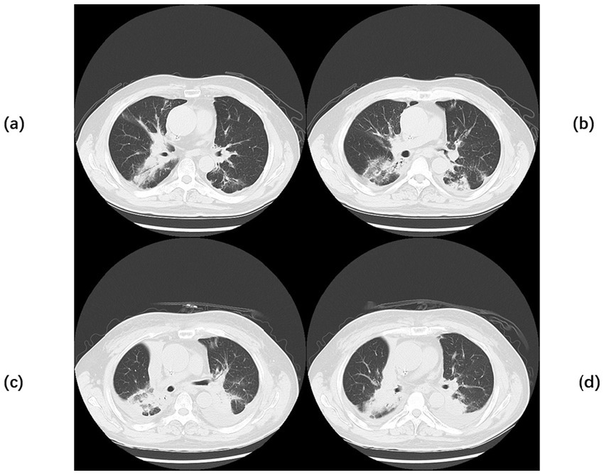 A 42-year-old woman was admitted to the hospital on 19 September 2023, with a 2-month history of paroxysmal cough and wheezing. She had a 2-year history of follicular non-Hodgkin lymphoma and had received maintenance therapy with Obinutuzumab. It is worth mentioning that the patient was admitted to an outside hospital on several occasions for coughing, wheezing, expectoration of white mucoid sputum, fever up to 38°C, and generalized fatigue. At the outside hospital, a chest CT showed left lung pneumonia, and she received symptomatic treatment with moxifloxacin, methylprednisolone, and bromhexine. Two days after hospital discharge, her symptoms worsened, and she was admitted to our hospital for further management. Upon admission, physical and laboratory examinations were performed. Physical examination revealed temperature, 37°C; pulse rate, 78 bpm; respiratory rate, 19 rpm; blood pressure, 125/78 mm Hg; oxygen saturation, 97%. Bilateral coarse breath sounds with scattered wet rales were auscultated. Laboratory investigations showed: complete blood count demonstrated white blood cell count of 4.21 × 109/L (normal range: 4.0–10.0 × 109/L), eosinophil count of 0.03 × 109/L (normal range: 0.05–0.5 × 109/L). C-reactive protein was 84.0 mg/L (normal range: <10 mg/L), significantly elevated, indicating active inflammation. Chest CT showed large, patchy high-density foci in the subpleural regions of the right lung with blurred margins and uneven density. The patient was admitted with fever (peak 38.1°C), cough with sputum production, and a positive SARS-CoV-2 nucleic acid test (polymerase chain reaction (PCR)). Simnotrelvir tablets/Ritonavir tablets (co-packaged) were initiated, along with intravenous Cefoperazone sodium/Sulbactam sodium for antibacterial treatment and ambroxol hydrochloride for symptomatic relief to facilitate sputum expectoration. On the seventh day of admission, the patient’s SARS-CoV-2 test (PCR) result turned negative; however, the patient continued to present with cough and sputum production. Fiberoptic bronchoscopy was performed to clarify the underlying etiology, and bronchoalveolar lavage fluid (BALF) was sent for metagenomic next-generation sequencing (mNGS) and culture. On the ninth day of admission, the results showed the presence of K. pneumoniae, Rhizopus delemar, Candida albicans, Rhizopus oryzae, and parainfluenza virus. Where R. delemar (reads 710 signal intensity: high), R. oryzae (reads 453 signal intensity: high). Both are Mucoraceae fungi. Culture of BALF revealed Aspergillus flavus. Intravenous piperacillin-tazobactam was administered to combat the bacterial infection. Voriconazole (0.3 g every 12 h) was administered for the treatment of Aspergillus infection. Amphotericin B cholesteryl sulfate complex for injection (50 mg, gradually titrated to 250 mg) was initiated as antifungal therapy against mucormycosis. On the 17th day of admission, repeat blood tests revealed: white blood cell count 3.19 × 109/L (normal range: 4.0–10.0 × 109/L); monocyte percentage 15.5% (normal range: 3–10%); lymphocyte count 0.44 × 109/L (normal range: 0.8–4.0 × 109/L); and serum albumin concentration 36.7 g/L (normal range: 35–50 g/L). After 21 days of hospitalization and sequential antifungal therapy with Isavuconazole, the patient was discharged. Two months after continuous therapy, a repeat chest CT revealed patchy and flocculent foci with mildly increased density in the subpleural regions of the right lower lobe, characterized by blurred margins and heterogeneous attenuation. These findings were significantly improved compared to prior scans (Figure 3). Temperature chart and medication chart for Case 2 (Figure 4).