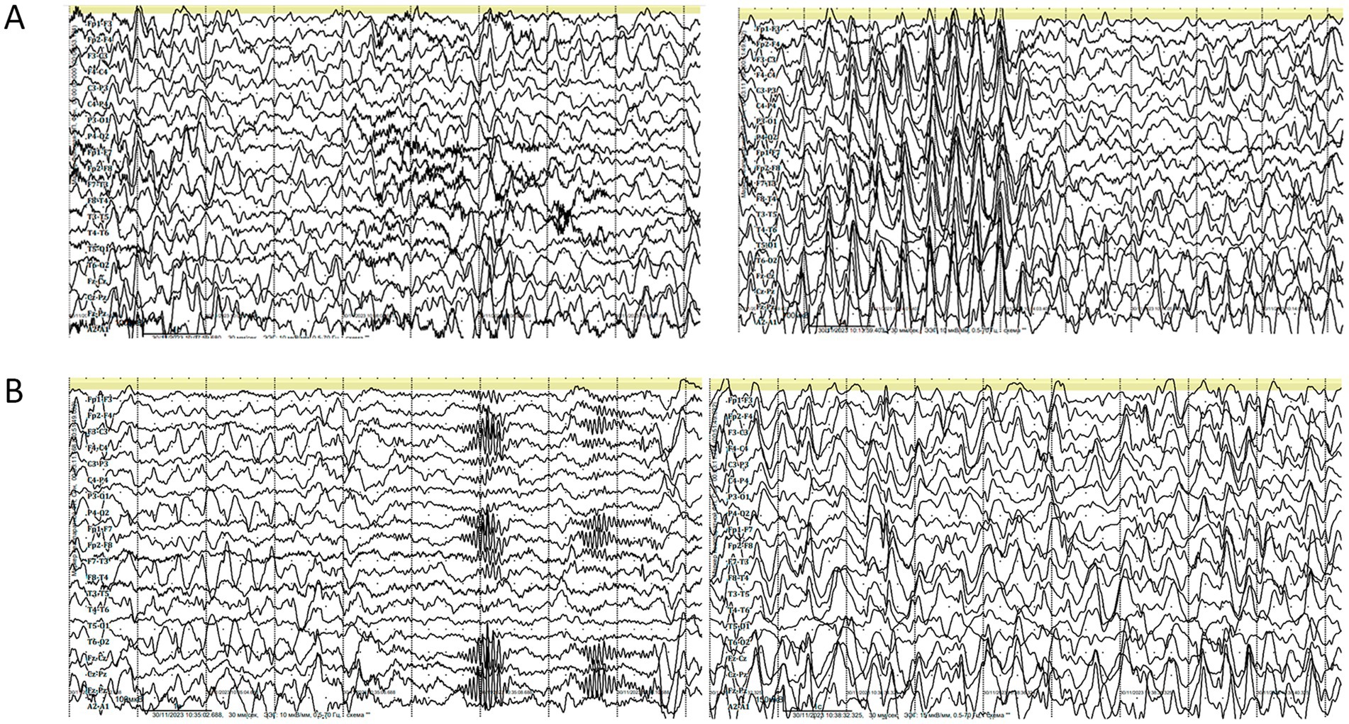Figure 3. (A) Electroencephalography (EEG) during wakefulness (age 7 years and 6 months). Parameters: speed = 30 mm/s, sensitivity = 10 μV/mm, high-frequency filter = 0.5 Hz, low-frequency filter = 70 Hz, notch filter = 50 Hz, bipolar longitudinal montage. (B) EEG during daytime sleep (age 7 years and 6 months). Parameters: speed = 30 mm/s, sensitivity = 10 μV/mm, low-frequency filter (LFF) = 0.5 Hz, high-frequency filter (HFF) = 70 Hz, notch filter = 50 Hz, bipolar longitudinal montage.