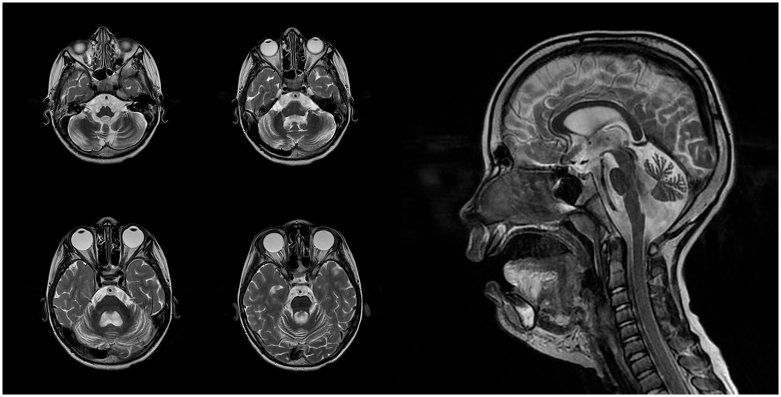 The patient was under continuous medical supervision at the Department of Hematology and Chemotherapy, Russian Children’s Clinical Hospital (RCCH), starting at 5 months of age. The patient also received follow-up care from the Otorhinolaryngology Department. Beginning at age 7.5 years, the patient was monitored by the Department of Psychoneurology, and from age 8, by the Department of Medical Genetics. The patient underwent regular multidisciplinary evaluations at 6-month intervals throughout the disease course. Magnetic resonance imaging (MRI) was performed using a GE Discovery 750w scanner in three orthogonal planes under general anesthesia. The imaging protocol included an axial T2-weighted (TR 6198 ms, TE 108.864 ms), an axial FLAIR (TR 10,500 ms, TE 140 ms), and sagittal T1-weighted (TR 923 ms, TE 12.392 ms) sequences. Electroencephalographic (EEG) recordings were acquired using the Encephalan video-EEG monitoring system (Medicom MTD, Russia) with electrodes positioned according to the international 10–20 system.