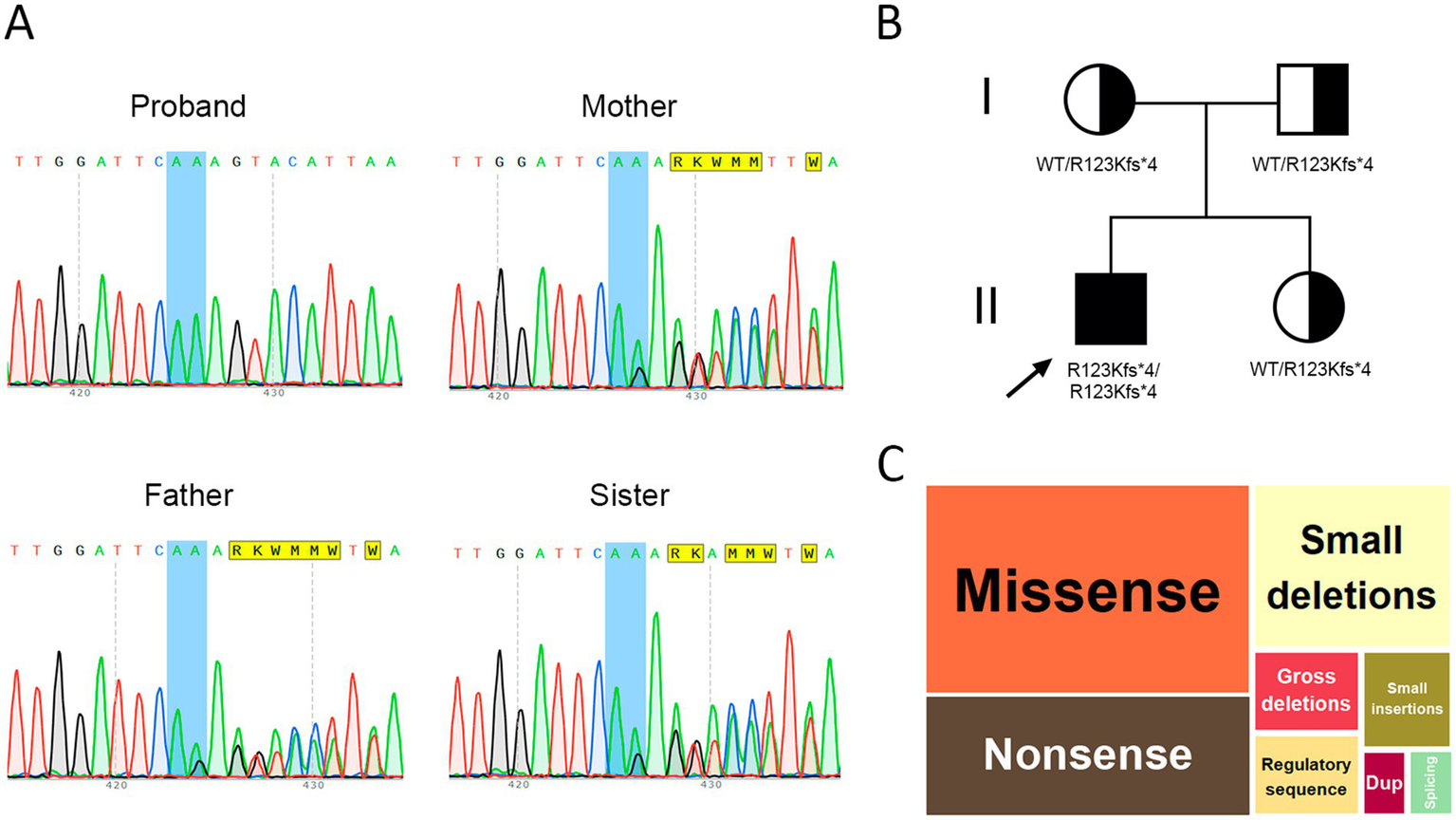 (A) Sanger sequencing results in the nuclear family, (B) Pedigree of the proband, (C) Distribution of variants in the CLN5 gene by type, dup – duplication.
