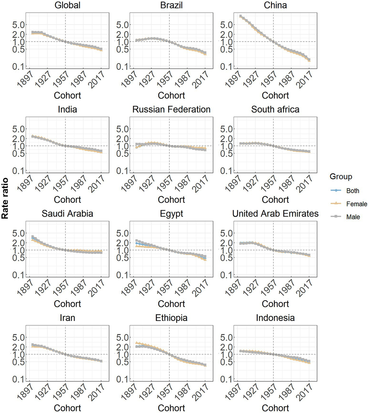 Cohort effects globally exhibited a continuous decline across successive birth cohorts over the past thirty years, as seen in Figure 5. This pattern was particularly prominent in most member countries (China, India, Saudi Arabia, Egypt, the United Arab Emirates, Iran, Ethiopia and Indonesia). In the Russian Federation, South Africa and Saudi Arabia, the RRs associated with certain birth cohorts initially remained relatively stable and subsequently began a decline.