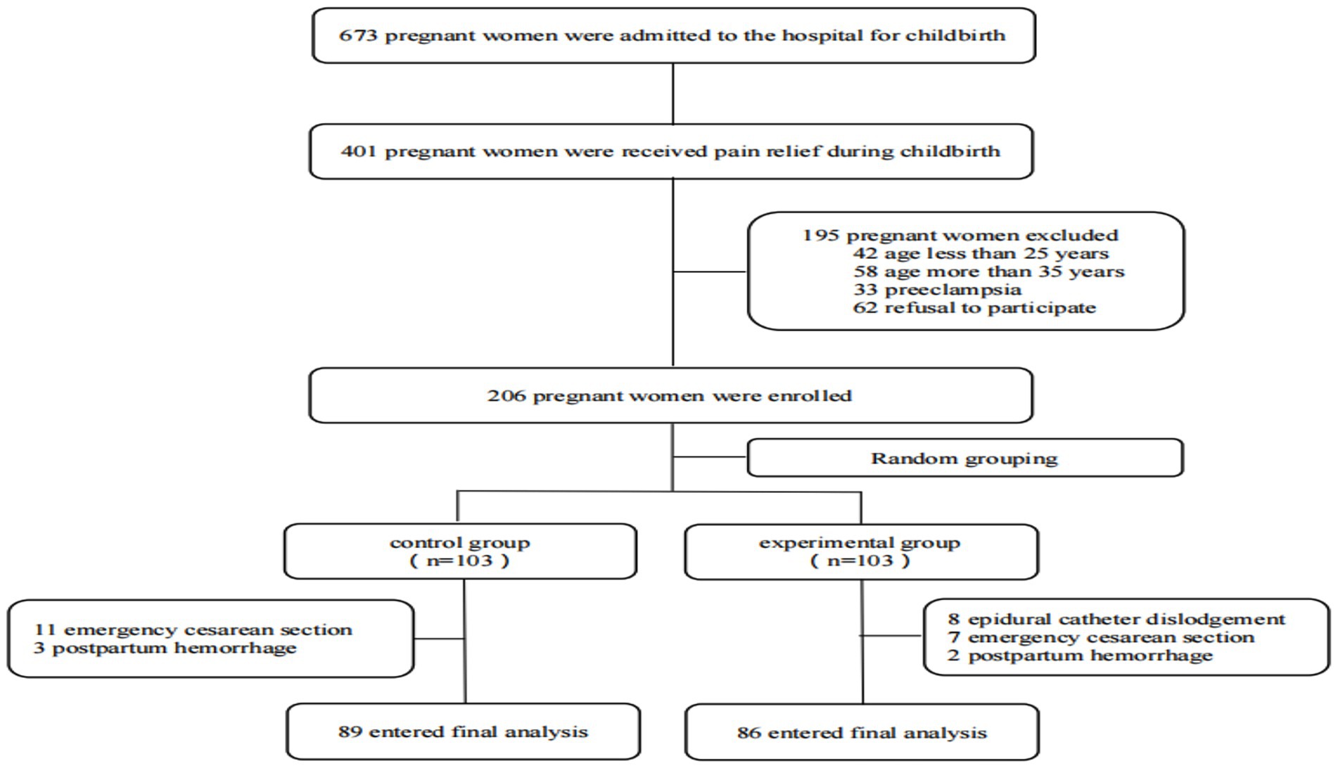Flowchart depicting a study process with pregnant women. Initially, 673 women were admitted for childbirth; 401 received pain relief, and 195 were excluded due to various reasons such as age and preeclampsia. 206 women were enrolled, split into control and experimental groups, each with 103 participants. In the control group, complications included 11 emergency C-sections and 3 postpartum hemorrhages, with 89 entering final analysis. The experimental group had 8 epidural catheter dislodgements, 7 emergency C-sections, and 2 postpartum hemorrhages, with 86 entering final analysis.