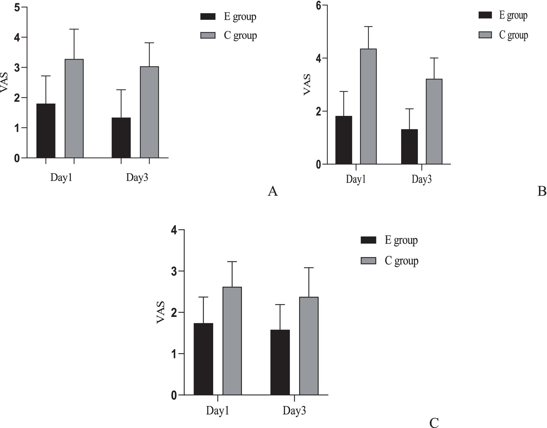 Bar charts labeled A, B, and C compare VAS scores for E and C groups on Day 1 and Day 3. Scores range from 0 to 5. Each chart shows differences between groups, with the C group generally scoring higher. Legends indicate black bars for E group and gray bars for C group.