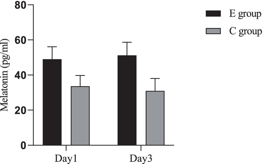 Figure 3. Comparison of melatonin levels between the two groups. Inter-group comparison: Day 1: t = 11.616, p < 0.001; Day 3: t = 13.973, p < 0.001. Intra-group comparison: C group: t = 2.032, p = 0.045; E group: t = 1.524, p = 0.131.