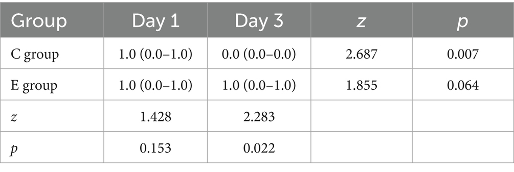 The results showed that there was no significant difference in MBS scores between the two groups on the first day (p > 0.05), but on the third day, the lower extremity blockade score of patients in the E group was significantly lower than that in the C group (p < 0.05), which did not affect the patients’ daily life. At the same time, when comparing within the groups, there was no significant difference in the E group (p > 0.05), while the score of the C group on the third day was significantly lower than on the first day (p < 0.05) (Table 2).
