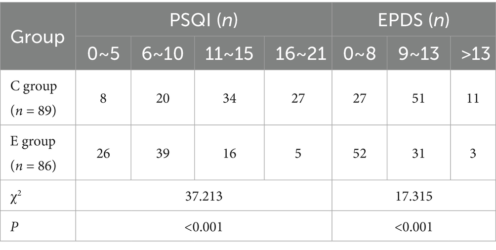 The PSQI and EPDS scores of two groups of patients were compared. The results showed that there were significantly more patients with low PSQI and EPDS scores in Group E than in Group C, with statistically significant differences (p < 0.05). This indicates that the sleep quality and emotional state of parturients in Group E were significantly better than those in Group C (Table 3).
