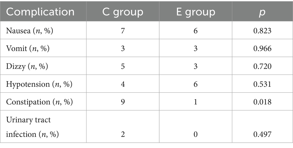 There was no significant difference in the incidence of postpartum nausea, vomiting, dizziness, hypotension, and urinary tract infection between the two groups of parturients (p > 0.05), while the number of patients with constipation in the C group was significantly higher than that in the E group (p < 0.05) (Table 4).