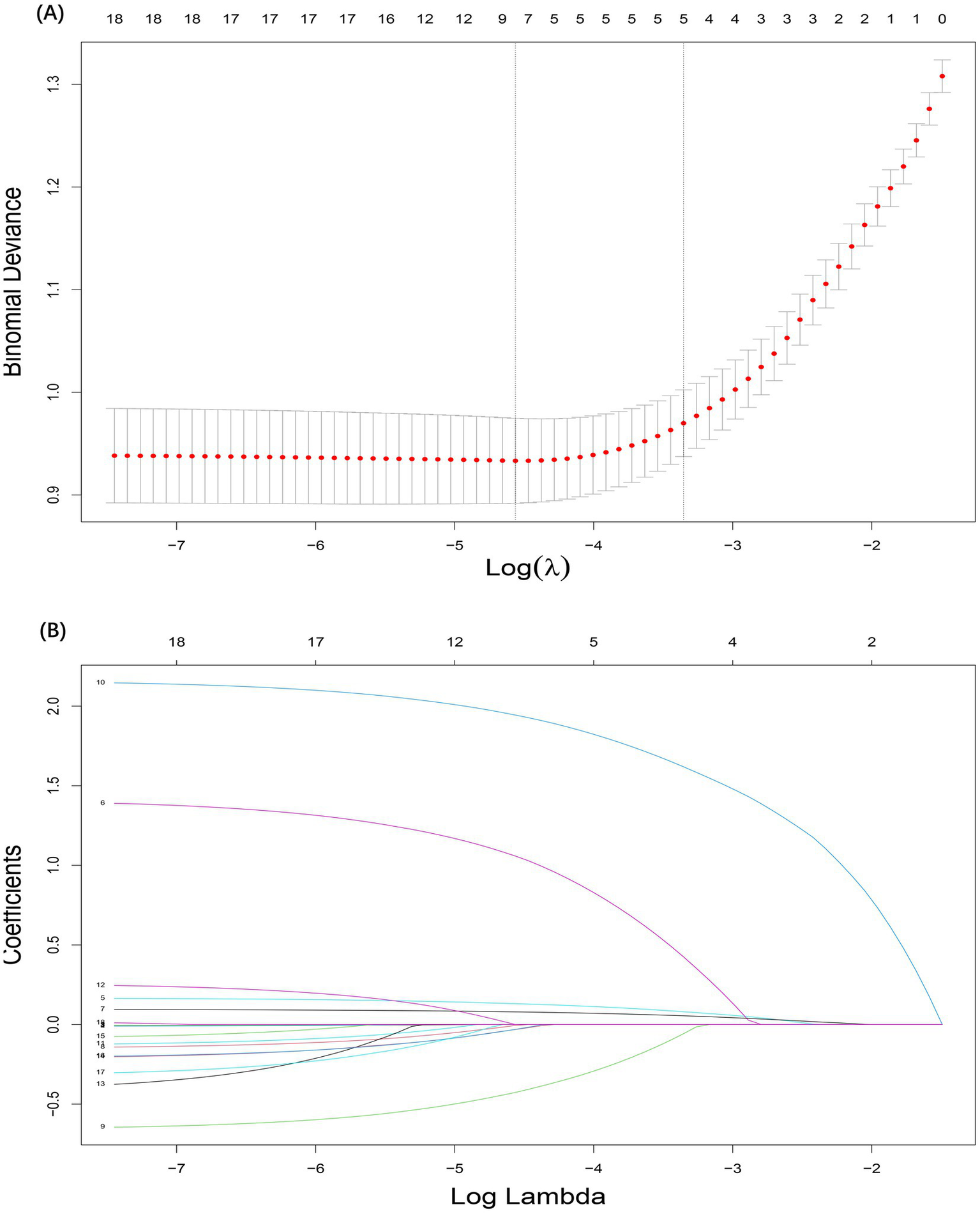 The incidence of PONV (yes/no) was the dependent variable, and the candidate predictors related to PONV were the independent variables. Candidate predictors associated with PONV were included through a literature review and group discussion. Eventually, 18 candidate predictors were included in the lasso regression analysis. The details of the predictors are shown in Table 1. The results of lasso regression analyses are detailed in Table 2. The outcome of study was incidence of PONV. PONV was defined as epigastric discomfort, nausea and retching with or without vomiting that occurred within 24 h after surgery (21, 22). At 24 h postoperatively, the investigators assessed the incidence of nausea and vomiting in the patients through telephone follow-up. The motion sickness was recorded using the Visual Analog Scale (VAS) (23). The level of preoperative anxiety was evaluated using the Beck Anxiety Inventory (BAI) (24). The process of data collection was conducted by two independent investigators who were professionally trained and blinded to the purpose of this study. Other candidate risk factors, such as anesthesia time and the type of artificial airway were also collected via the electronic medical record system. The one-way analysis and LASSO regression were used to exclude possible confounding variables. Furthermore, a research assistant visited the patient preoperatively and recorded basic information, including age, weight, fasting time, length of surgery, and ASA classification.