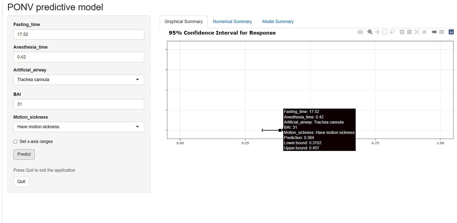 Liu J, Han L, Zhang F, Jiang Y, Cheng L, Qin S and Fang S (2025) Construction and validation of a web-based dynamic predictive model for the risk of postoperative nausea and vomiting in patients undergoing day-case hysteroscopic surgery. Front. Med. 12:1582546. doi: 10.3389/fmed.2025.1582546