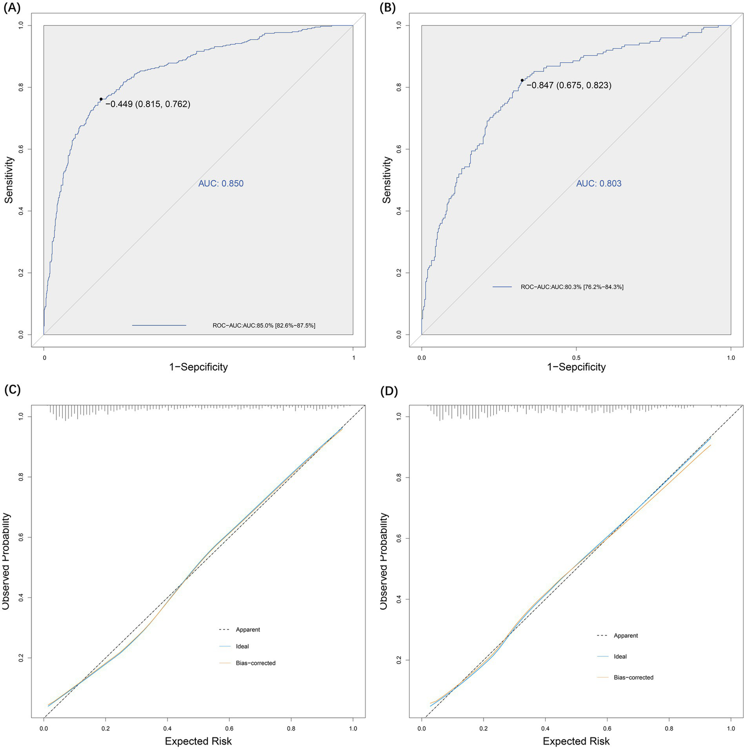 A total of five predictors were included in the PONV risk prediction model: (1) motion sickness (OR, 8.53; 95% CI, 6.21–11.81), (2) anesthesia time (OR, 4.20; 95% CI, 2.09–8.65), (3) fasting time (OR, 1.17; 95% CI, 1.13–1.22), (4) anxiety score (OR, 1.10; 95% CI, 1.08–1.12), and (5) artificial airway (OR, 0.54; 95% CI, 0.39–0.74). The area under the ROC curve for the training cohort and validation cohort was 85.0% (95% CI: 82.6–87.5%) and 80.3% (76.2–84.3%), respectively.