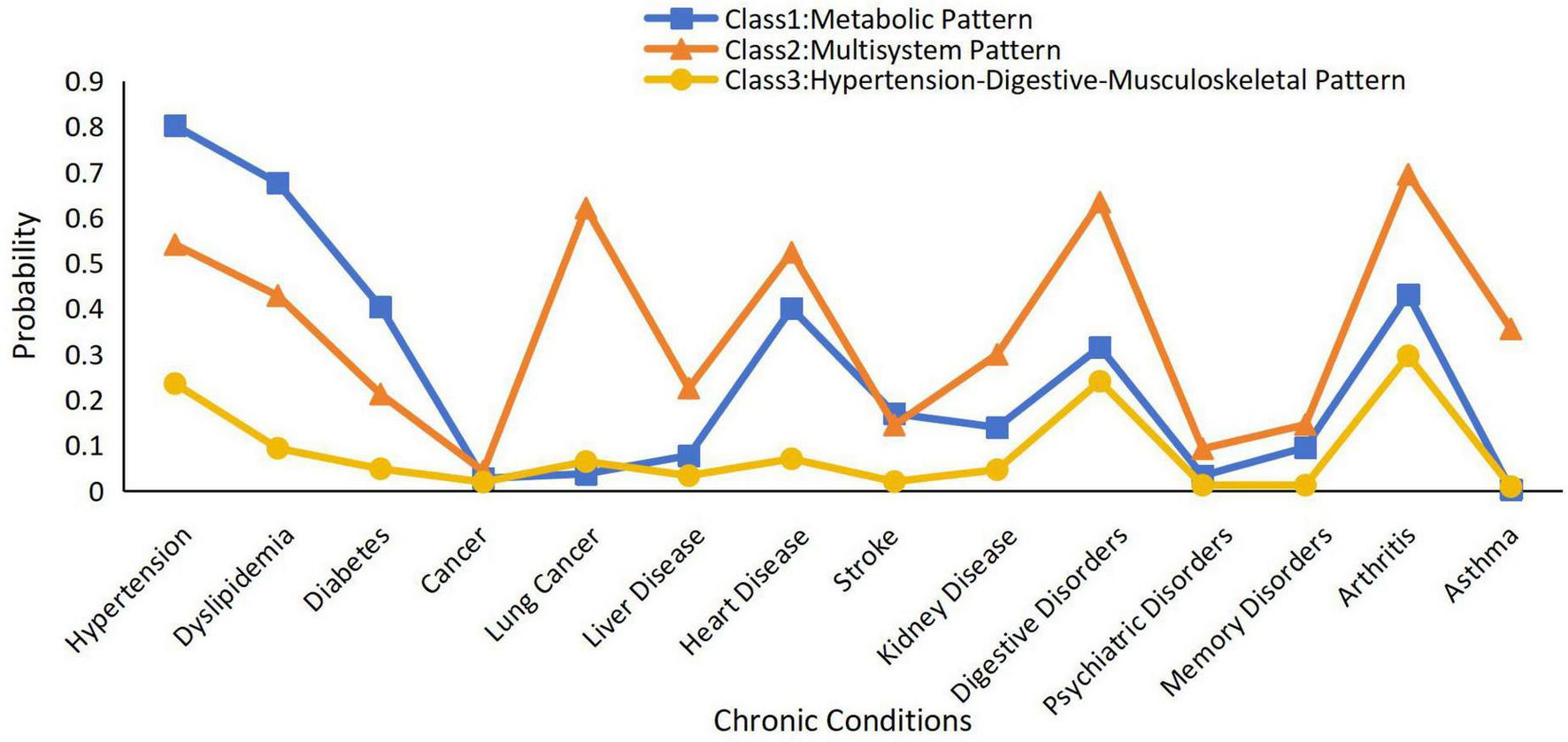 Class 1 had 4,066 participants, with a high prevalence of hypertension, dyslipidemia, and diabetes; thus, class 1 was named “Metabolic Pattern.” Class 2 had 2,433 participants, with a high prevalence of hypertension, dyslipidemia, diabetes, arthritis, and lung, liver, heart, kidney, digestive, and psychiatric diseases. Class 2 involved several systems and was defined as a “Multisystem Pattern.” Class 3 contained 12,198 samples, with a high prevalence of hypertension, digestive diseases, and arthritis, and it was defined as a “Hypertension-Digestive-Musculoskeletal Pattern” (33).