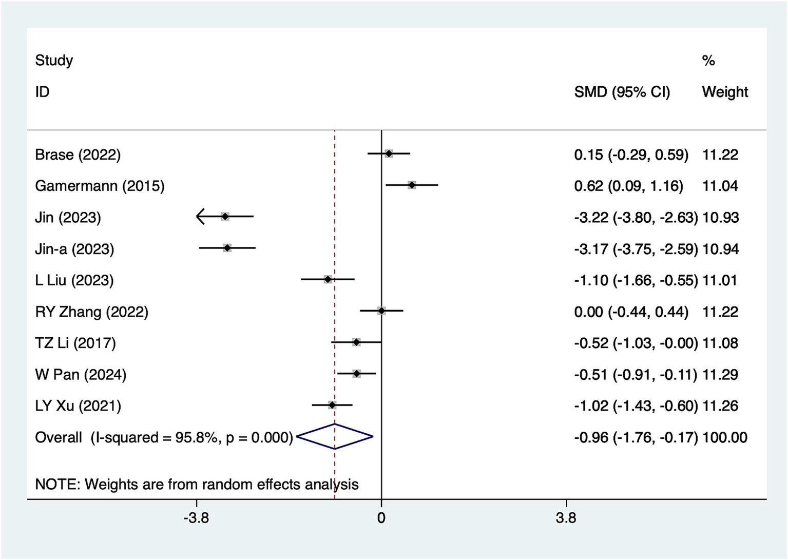 Nine studies reported 48-h pain scores. Due to substantial heterogeneity (I2 = 95.8%, p = 0.001), a random-effects model was used for analysis. The results (Figure 5) suggested that acupuncture effectively reduced 48-h pain scores [SMD = -0.96, 95%CI (−1.76, −0.17)]. Subgroup analyses based on different acupuncture modalities (Table 2) showed that both electroacupuncture and conventional acupuncture were effective in reducing 48-h pain scores. Due to considerable heterogeneity, sensitivity analyses were conducted using a leave-one-out (literature-by-exclusion) approach (Supplementary Figure S6). The results indicated minimal sensitivity, suggesting that the analyses were robust and stable.