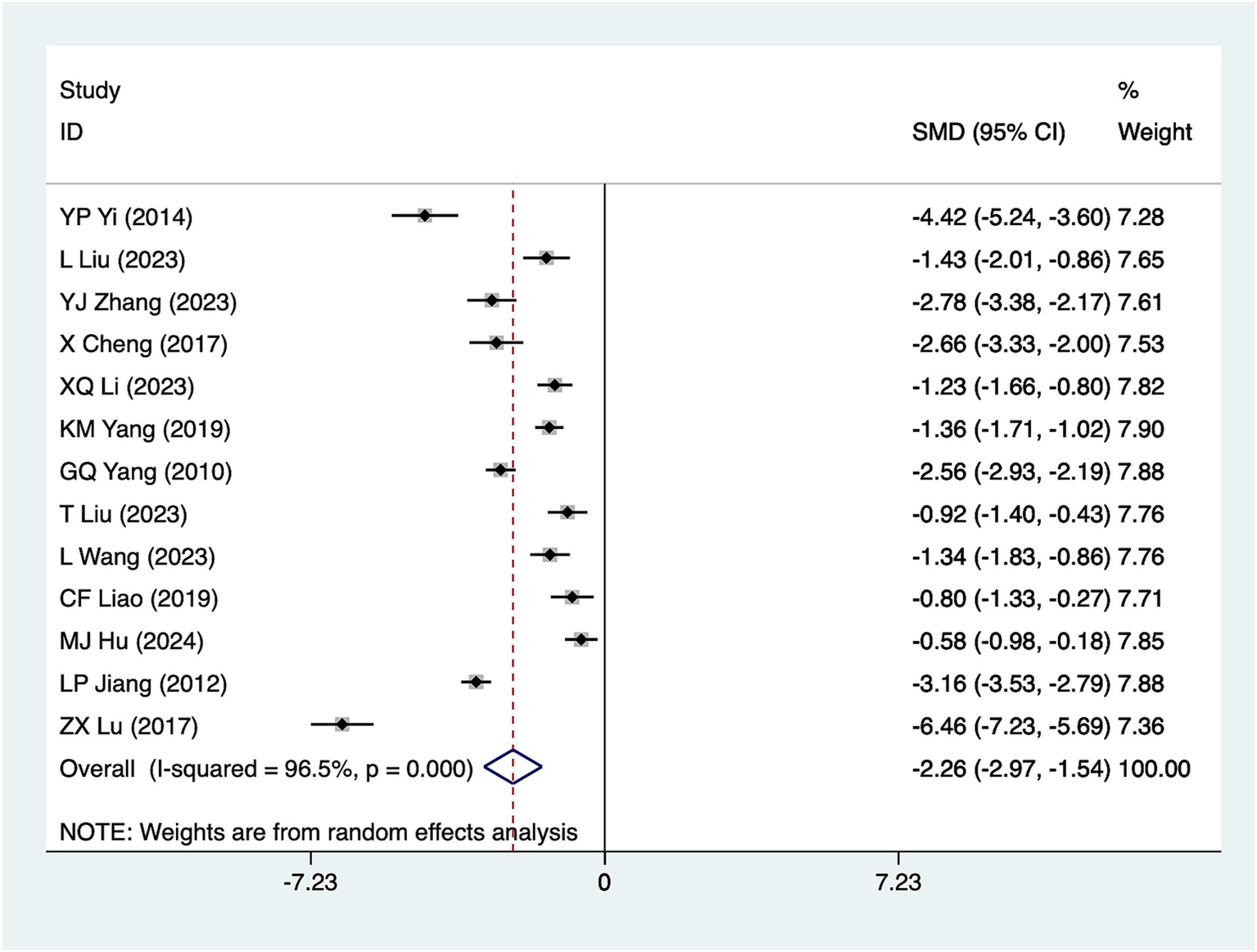 Five of the studies (28, 30, 32, 43, 44) included in the current round did not clearly report the blinding method and were therefore assessed as having an unclear risk of bias. Three studies (31, 43, 44) explicitly lacked information on blinding and were assessed as high-risk. Specific risk of bias scores are described in Supplementary Figures S1, S2. The GRADE rating for this analysis is presented in the Supplementary Table S2.