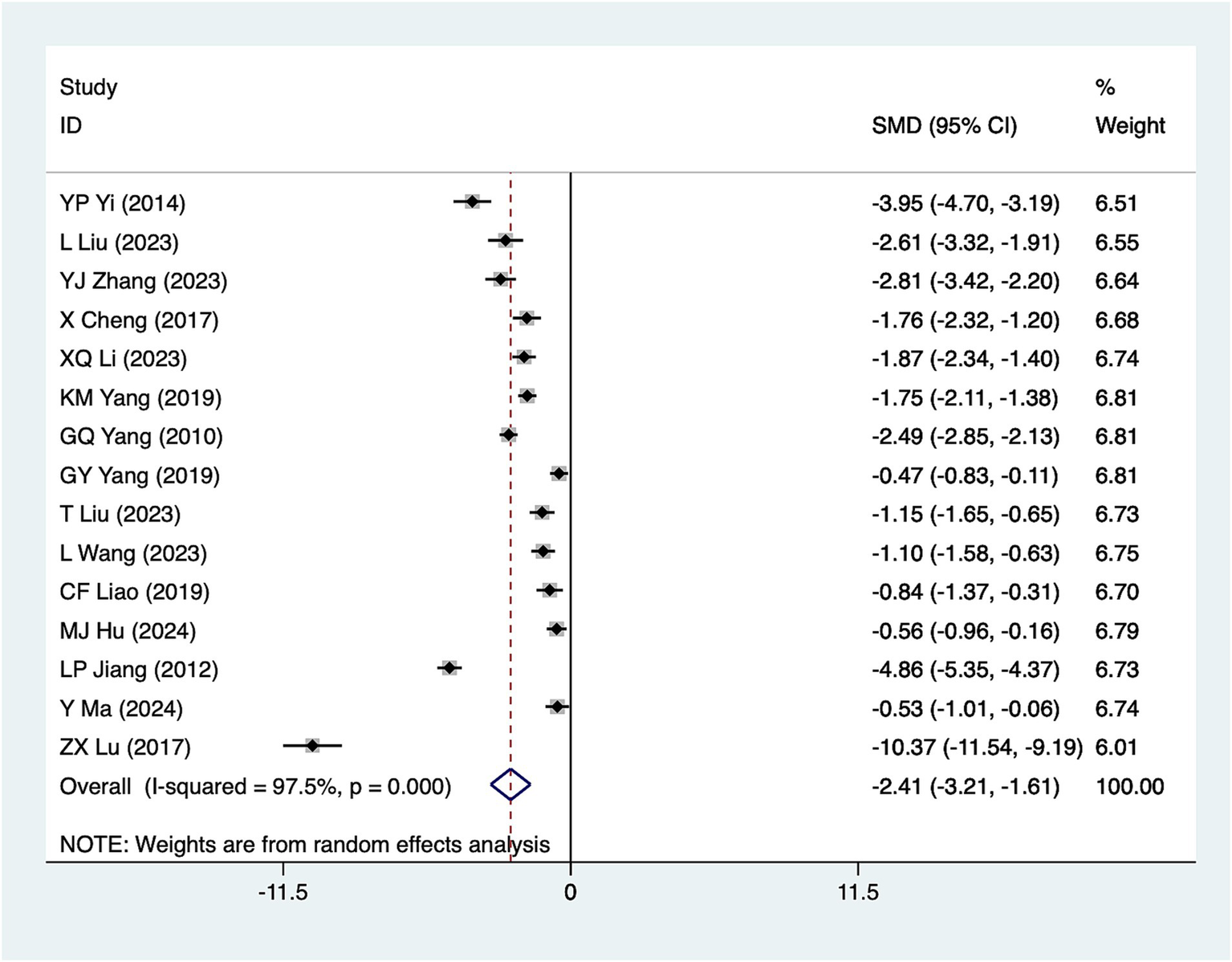 A total of 15 studies reported anal exhaust time. Due to significant heterogeneity (I2 = 97.5%, p = 0.001), a random-effects model was used for analysis. The results (Figure 7) suggested that acupuncture significantly reduced anal exhaust time [SMD = −2.41, 95% CI (−3.21, −1.61)]. Subgroup analyses based on different acupuncture modalities (Table 2) showed that conventional acupuncture was effective in reducing anal exhaust time. Due to the considerable heterogeneity, sensitivity analyses were conducted using a leave-one-out (literature-by-exclusion) approach (Supplementary Figure S9). The results suggested minimal sensitivity. Additionally, after excluding three high-risk studies (31, 43, 44), the effect size remained largely consistent (Supplementary Figure S10) [SMD = −2.31, 95% CI (−3.12, −1.50)], indicating that the analyses were robust and stable.