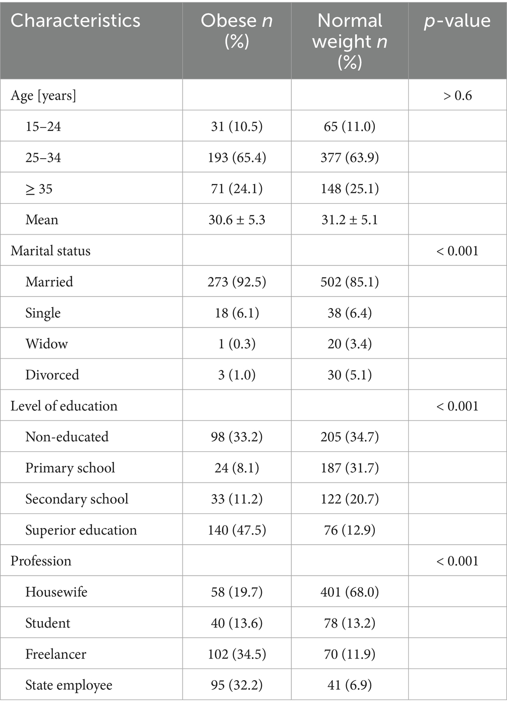 In comparison, the mean age in the normal-weight group was slightly higher, at 31.2 years. Although the proportion of married women remained high in this group (85.1%, p < 0.05), a significantly larger percentage had never attended school (34.7%, p < 0.05). Additionally, the majority of normal-weight women were housewives (68%), whereas only 18.8% were reported to be salaried or self-employed workers (p < 0.05) (Table 1).