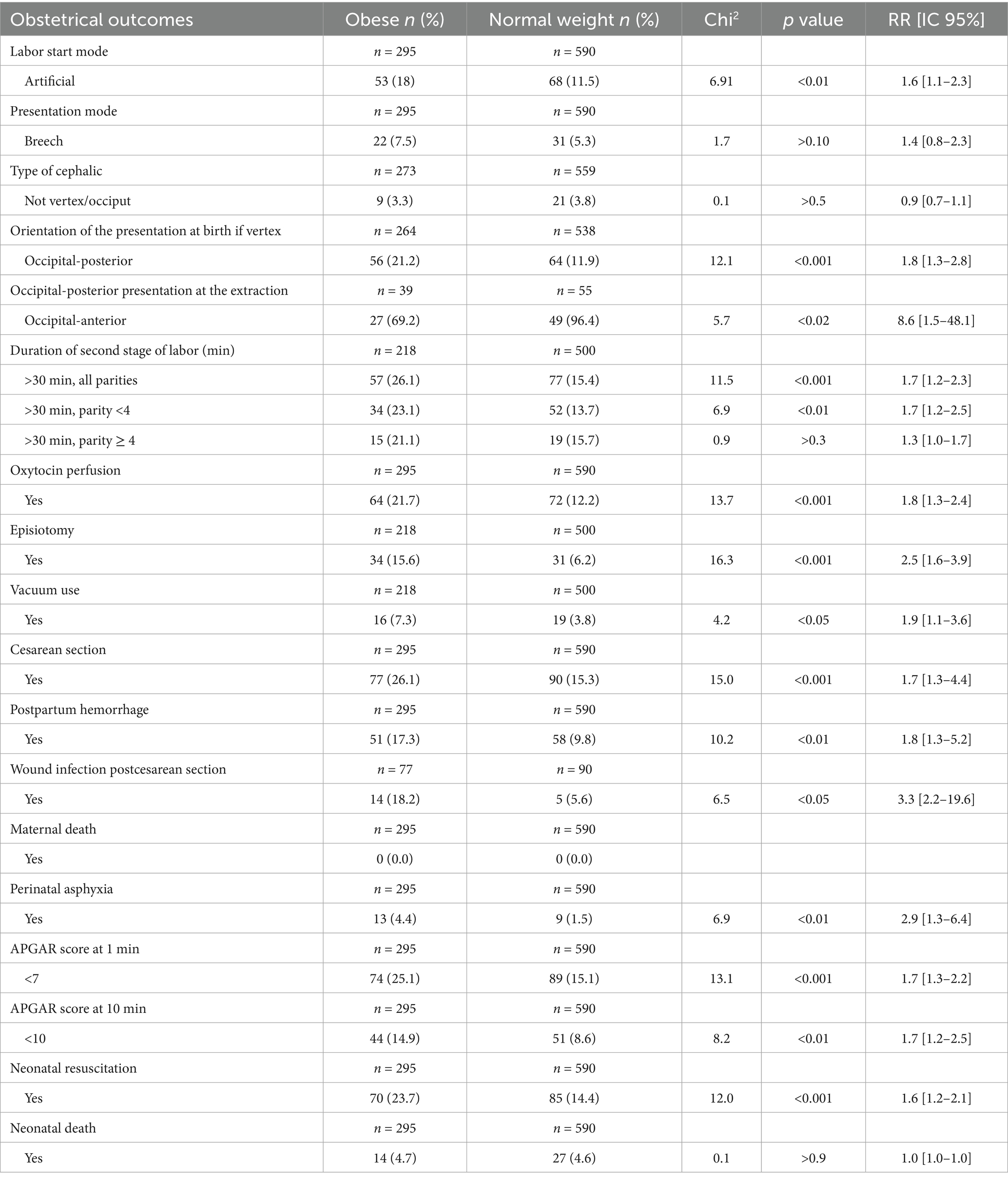Obese women also experienced a prolonged second stage of labor, particularly those with fewer than four previous deliveries. Furthermore, obesity was significantly associated with a higher need for oxytocin administration, a twofold increase in the rate of episiotomy, and nearly twice the frequency of operative vaginal delivery by vacuum extraction. A strong association was observed between obesity and cesarean delivery (RR = 1.7, 95% CI [1.3–4.4]) (Table 2).
