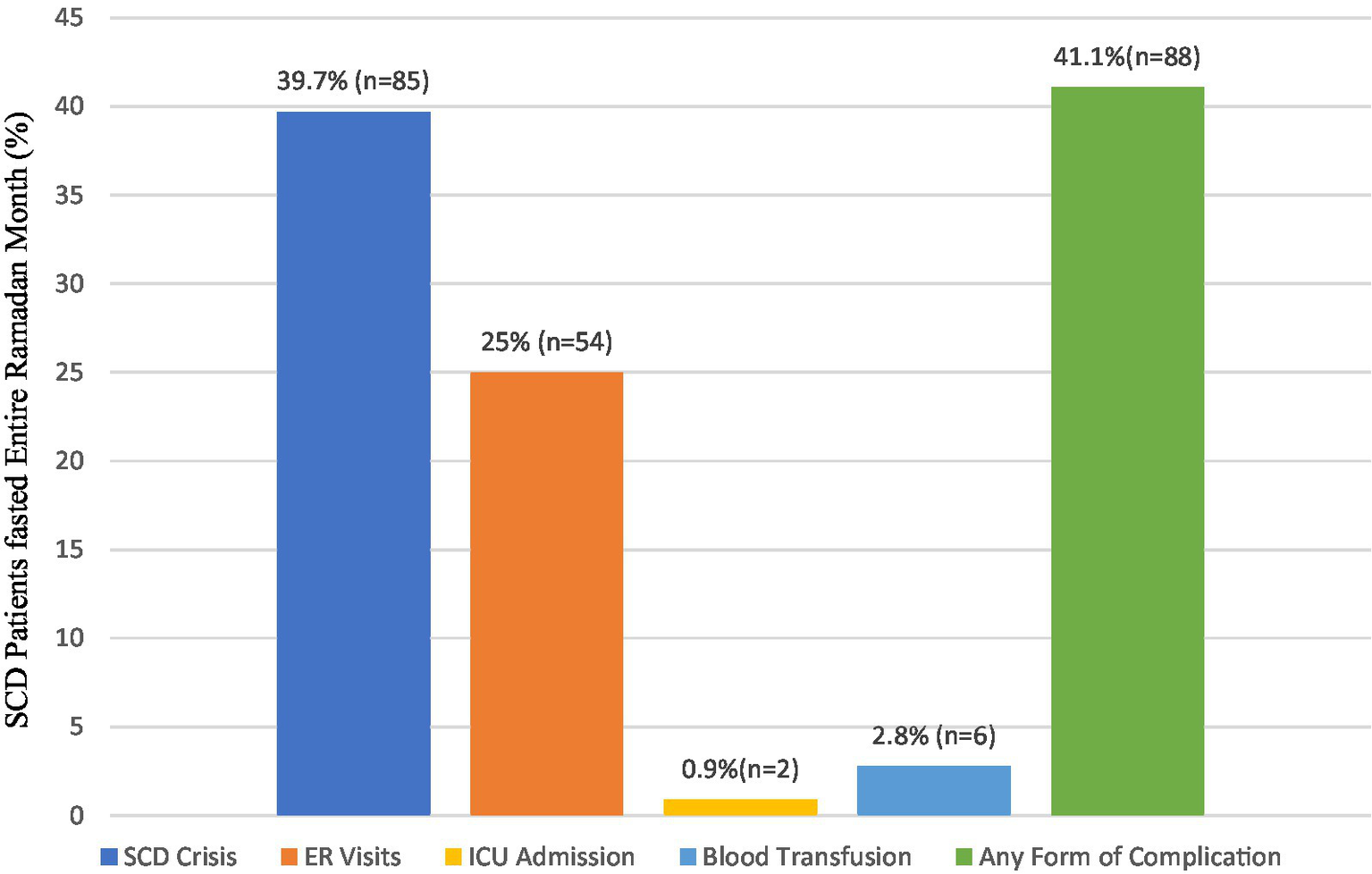 A total of 320 patients with SCD were evaluated, with a mean age of 32.6 years (SD ± 11.01) and the majority were females (63.1%). Among these participants, 214 (66.9%) observed Ramadan intermittent fasting (RIF) while 106 (33.1%) did not observe the fasting month or had interrupted fasting. Participants having secondary and university education were nearly twice as likely to fast the entire Ramadan (p = 0.025 and p = 0.003, respectively). History of SCD crises, emergency visits, acute chest syndrome, and intensive care unit admission were all significantly associated with lower odds of fasting the entire month (OR = 0.25, p = 0.019; OR = 0.25, p = 0.001; OR = 0.57, p = 0.035; and OR = 0.46, p = 0.003, respectively). Participants with more than four SCD episodes or more than four emergency room visits had significantly higher odds of experiencing complications within 30 days following Ramadan (OR = 3.31, p < 0.001 and OR = 2.55, p = 0.004, respectively).