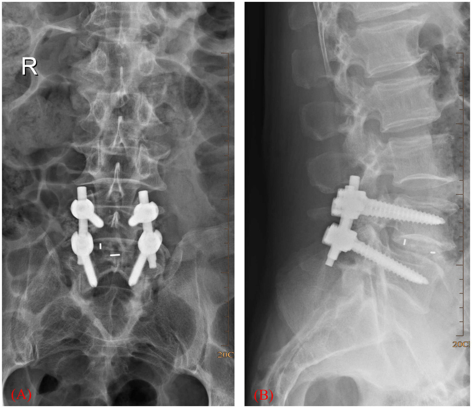 X-ray image showing lumbar interbody fusion surgery. (A) Coronary plane. (B) Sagittal plane.