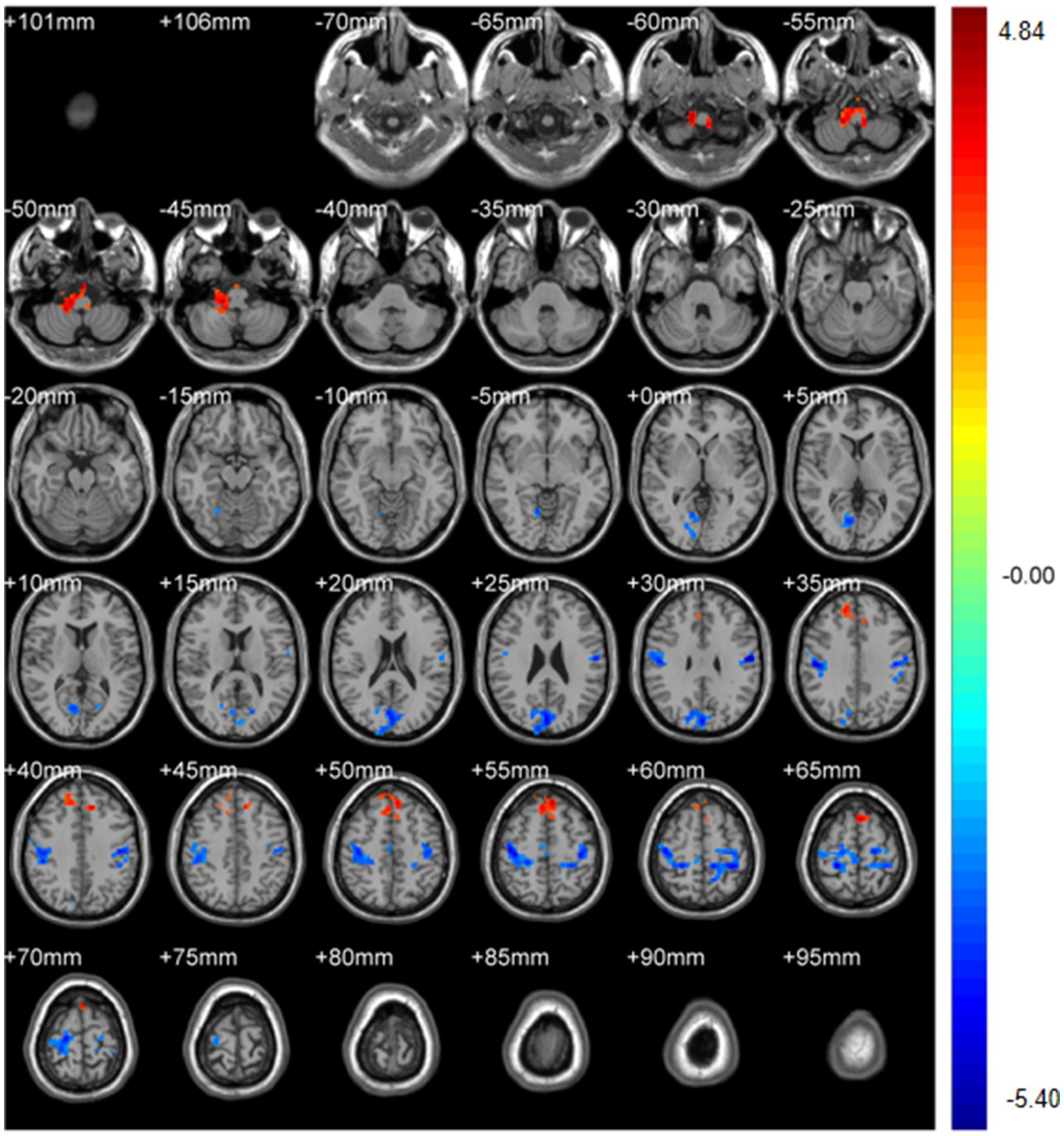 Figure 1. mALFF analysis. Two-sample t-test results are presented. Areas in red indicate significantly increased mALFF value. Areas in blue indicate significantly decreased mALFF value. In the comparison of mALFF value between patient group compared to control group showed significantly increased mALFF in Cerebellum_9_R and right Frontal_Sup_Medial_R.