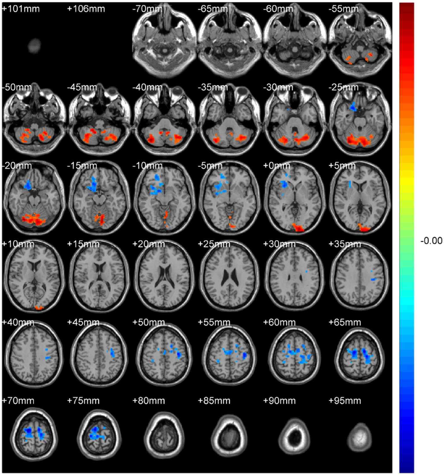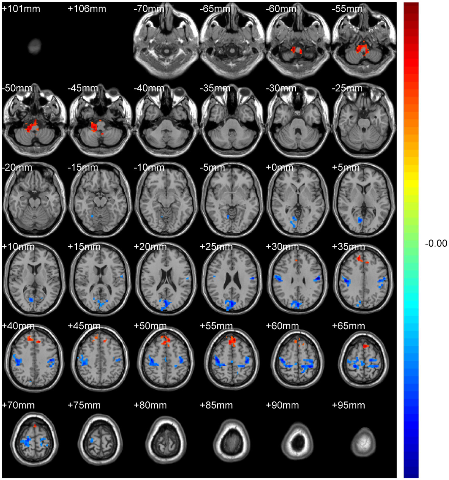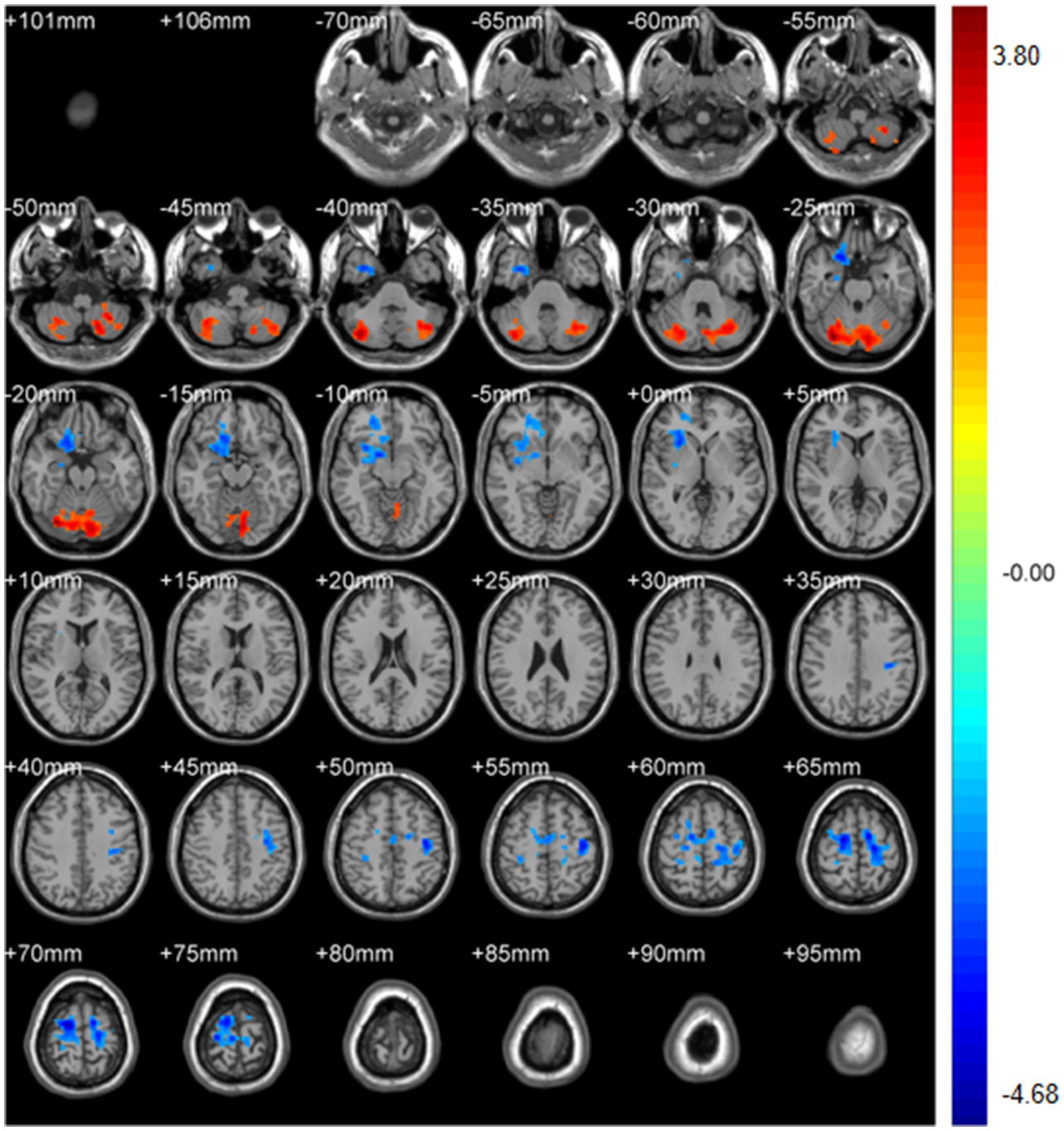 Figure 2. zALFF analysis. Two-sample t-test results are presented. Areas in red indicate significantly increased zALFF value. Areas in blue indicate significantly decreased zALFF value. In the comparison of zALFF value between patient group compared to control group showed significantly increased zALFF in Cerebellum_9_R and right Frontal_Sup_Medial_R.