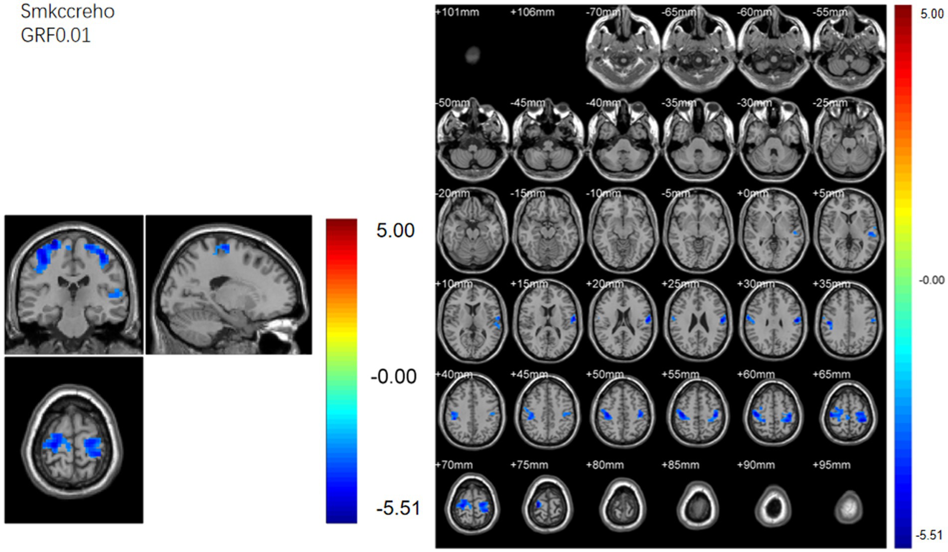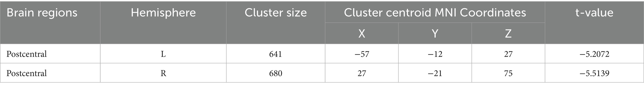 Regional homogeneity (ReHo) (Table 4; Figure 3): Using the SMKCC method, ReHo decreased in the left postcentral gyrus (MNI − 57, −12, 27; cluster = 641; t = −5.2072) and right postcentral gyrus (MNI 27, −21, 75; cluster = 680; t = −5.5139).