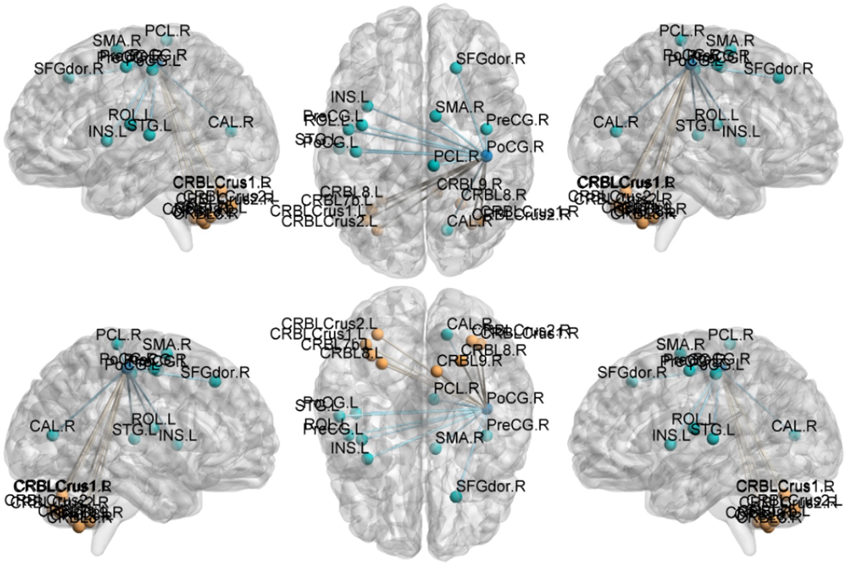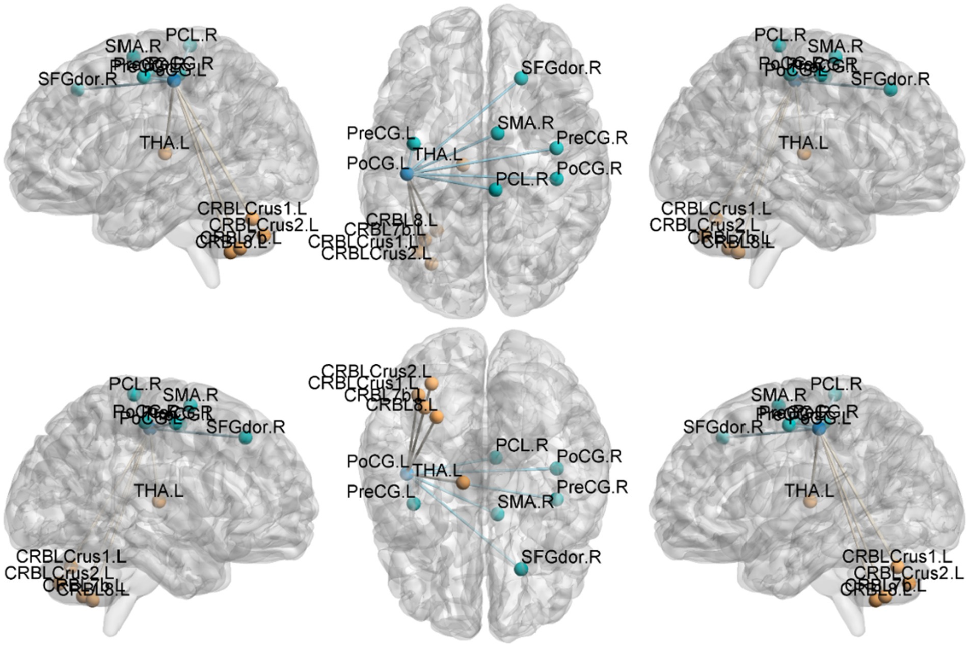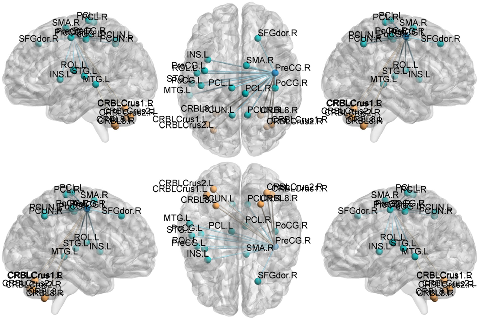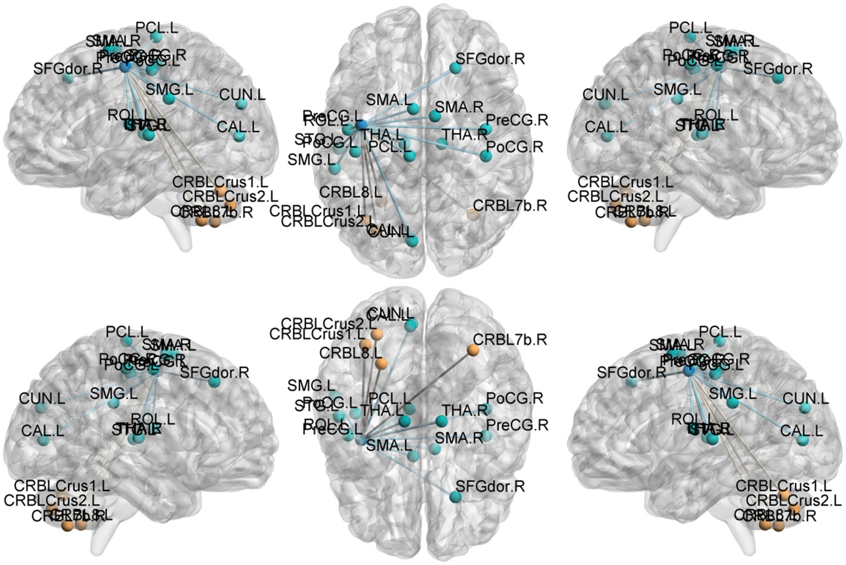 Figure 6. Functional connection with the left Precentral gyrus as the seed point for patient group compared to control group. The deep blue spheres represent regions of interest, the light blue spheres represent brain regions with decreased functional connectivity to the regions of interest, and the orange spheres represent brain regions.