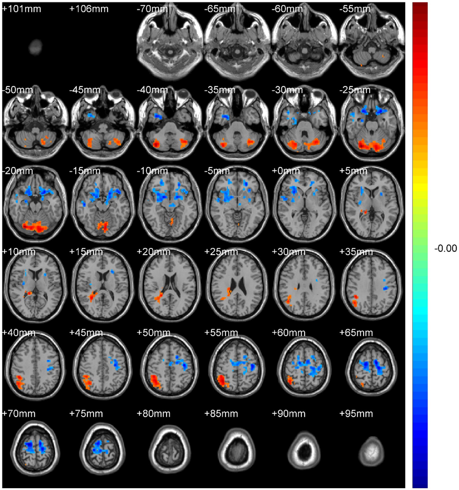 Figure 9. DegreeCentrality(Bi-SzDegreeCentrality). Areas in blue indicate significantly decreased value,areas in red indicate significantly increased value.
