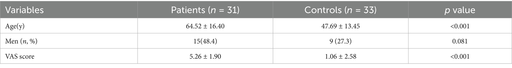 Thirty-one spinal diseases related pain patients (15 males/16 females; 64.52 ± 16.40 years) and 32 controls (9 males/23 females; 47.69 ± 13.45 years) were included after quality control. Groups did not differ in sex distribution (p > 0.05); VAS pain scores were higher in patient group (p < 0.001). Age was included as a covariate in imaging analyses. The demographic and clinical characteristics of patients are shown in Table 1.