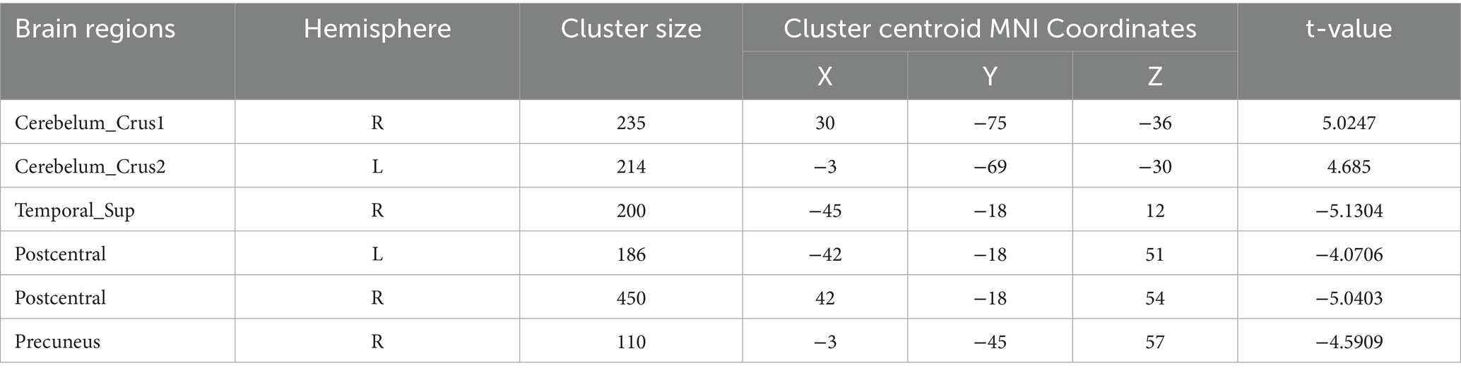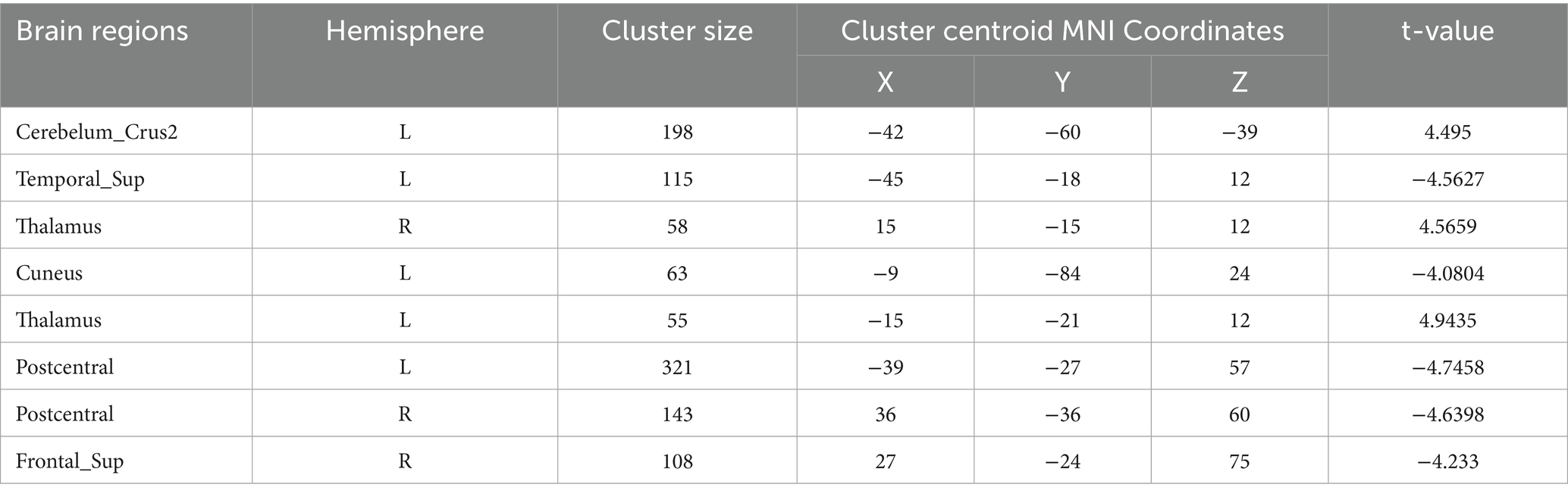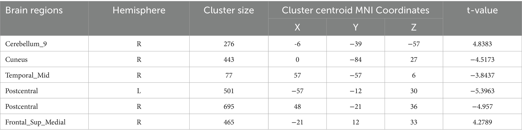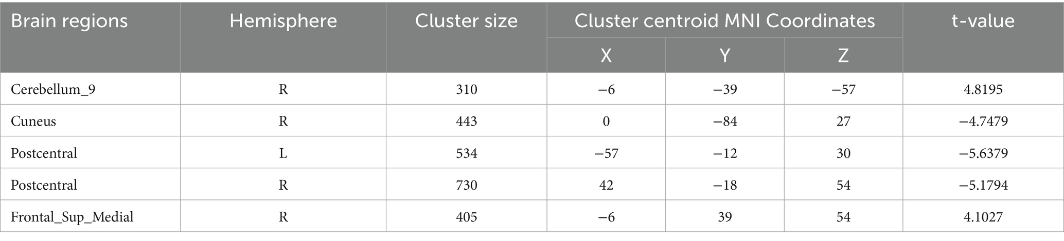 Regional spontaneous activity (mALFF / zALFF) (Tables 2, 3; Figures 1, 2): Relative to controls, patients showed higher mALFF in the right cerebellar lobule IX (MNI − 6, −39, −57; cluster = 276; t = 4.8383) and right medial superior frontal gyrus (MNI − 21, 12, 33; cluster = 465; t = 4.2789). Lower mALFF emerged in the bilateral postcentral gyrus [left: MNI − 57, −12, 30; cluster = 501; t = −5.3963; right: MNI 48, −21, 36; cluster = 695; t = −4.957], right cuneus (MNI 0, −84, 27; cluster = 443; t = −4.5173), and right middle temporal gyrus (MNI 57, −57, 6; cluster = 77; t = −3.8437). The zALFF map reproduced this pattern: increased activity in right cerebellar lobule IX (MNI − 6, −39, −57; cluster = 310; t = 4.8195) and right medial superior frontal gyrus (MNI − 6, 39, 54; cluster = 405; t = 4.1027), and decreased activity in the bilateral postcentral gyrus [left: MNI − 57, −12, 30; cluster = 534; t = −5.6379; right: MNI 42, −18, 54; cluster = 730; t = −5.1794] and right cuneus (MNI 0, −84, 27; cluster = 443; t = −4.7479).
