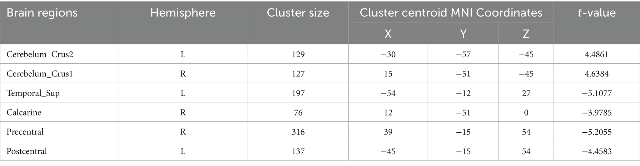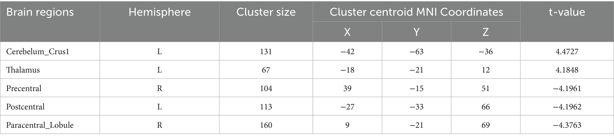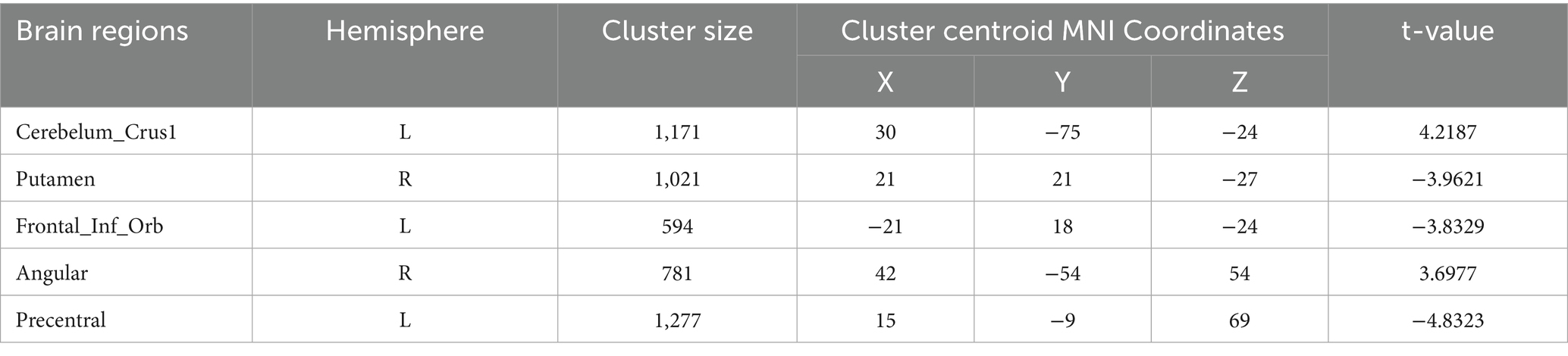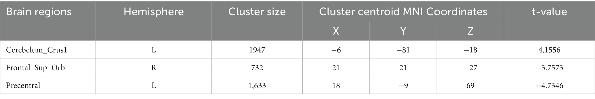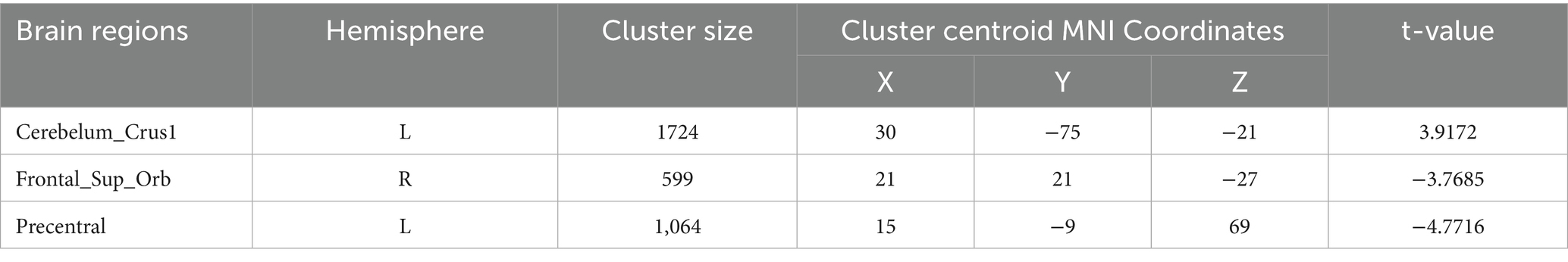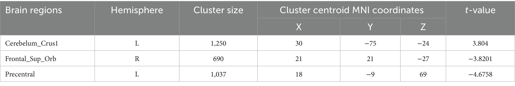 Weighted-SmDegreeCentrality: left Crus I (MNI 30, −75, −24; cluster = 1,250; t = 3.8040) showed increased degree centrality; right superior orbital frontal gyrus (MNI 21, 21, −27; cluster = 690; t = −3.8201) and left precentral gyrus (MNI 18, −9, 69; cluster = 1,037; t = −4.6758) showed decreased degree centrality.