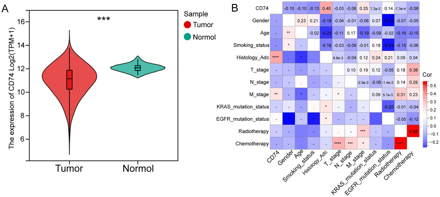Differential expression and clinical correlation analysis of CD74. (A) Violin plot of differential analysis of CD74 expression in tumor and normal tissues, as shown in the figure, normal tissues showed significantly higher expression; (B) Heatmap of correlation between CD74 and clinical features, red represents positive correlation, blue represents negative correlation, and the higher the degree of color, the more significant the correlation. (Significant symbol: –, p ≥ 0.05; *, p < 0.05; **, p < 0.01; ***, p < 0.001; ****, p < 0.0001).