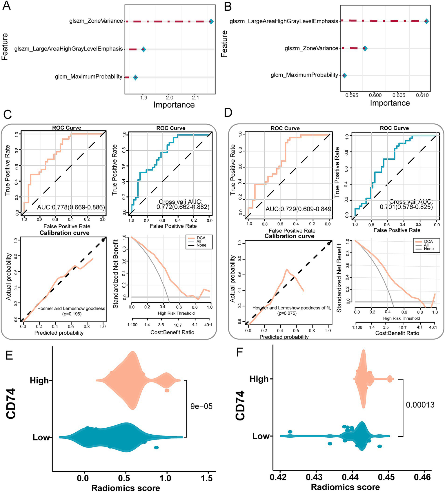 The LR radiomic model and SVM radiomic model provided the radiomics score for each sample. We employed the Wilcoxon test to assess whether there were differences between the high and low CD74 groups in terms of radiomics score.