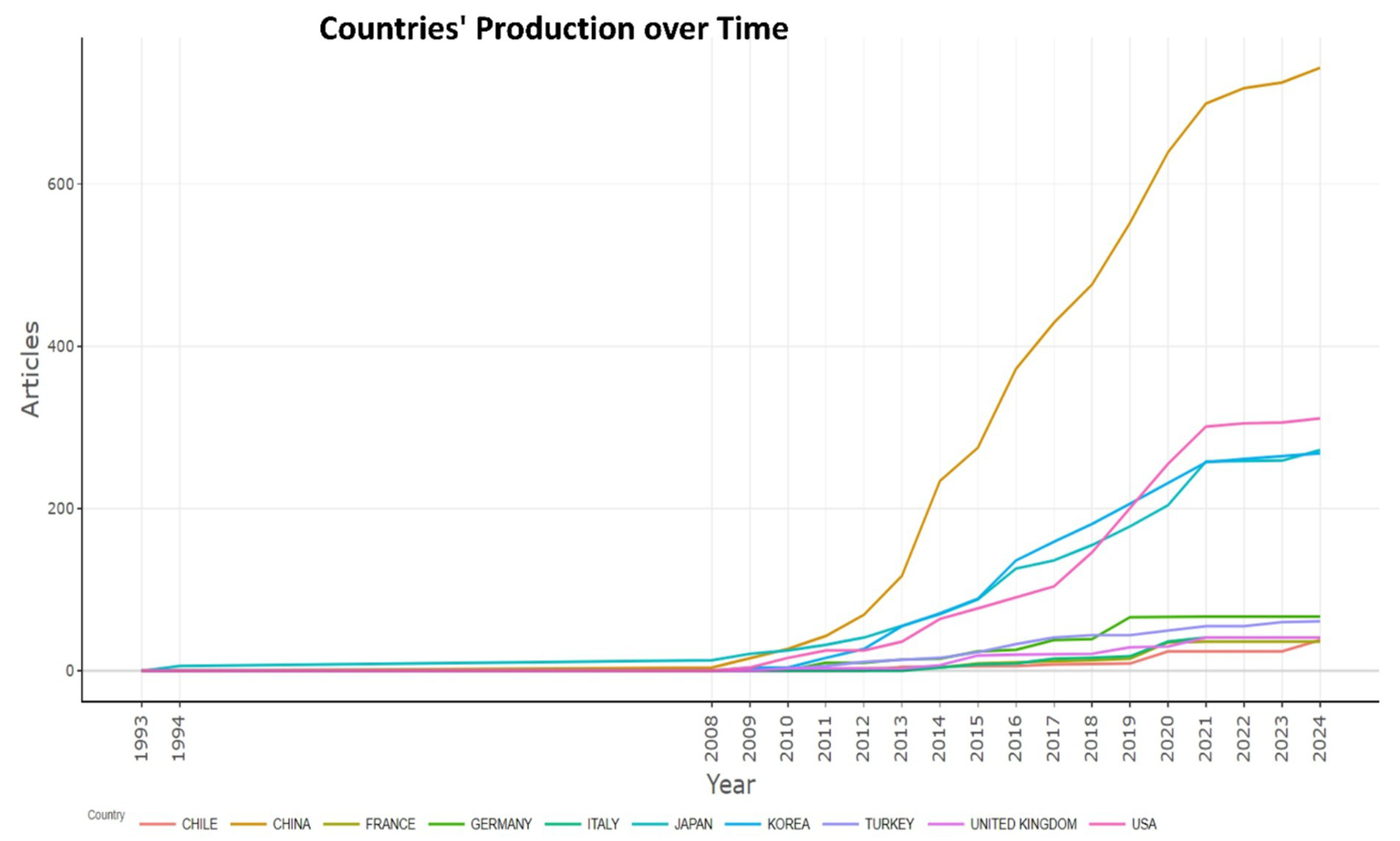 China leads in scientific productivity with 743 publications, illustrating the dominance and academic influence in the field of research of biomarkers used in the diagnosis and prognosis of gastric cancer in young patients. The second is the United States with 311 publications, and the third most prolific is Japan with 272 publications (Table 4). China’s productivity has also grown exponentially over the years, as illustrated in Figure 5.