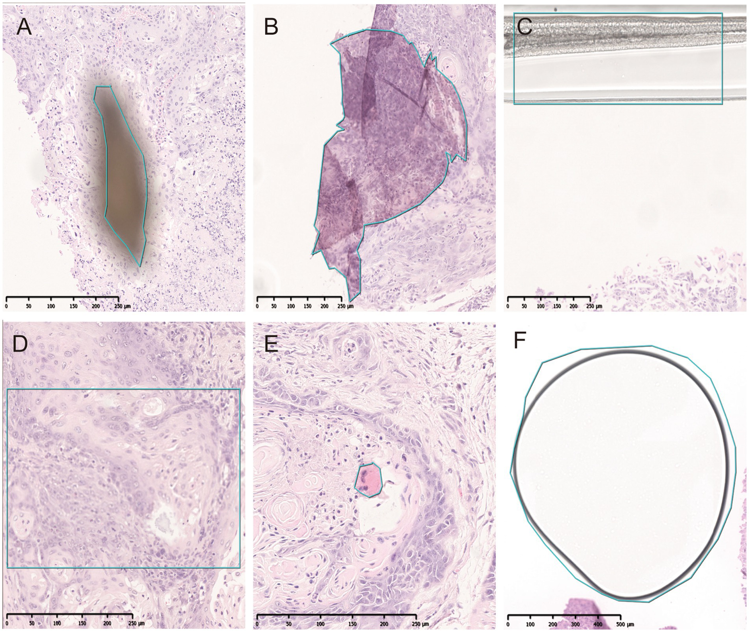 Artifacts identified by QC slide. (A) Dust. (B) Folds. (C) Coverslip. (D) Out-of-focus. (E) Pen marker. (F) Bubble.