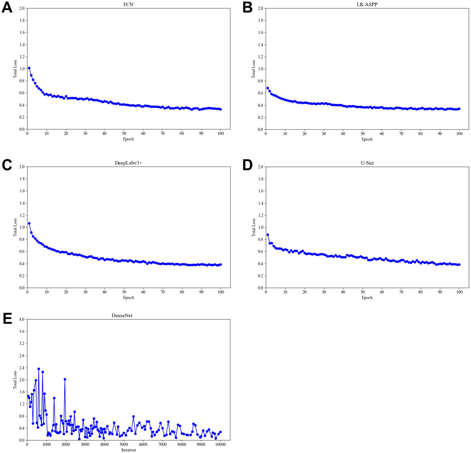 Total training loss during training of different algorithm models. (A) The total loss function diagram of the FCN model. (B) The total loss function diagram of the LR-ASSP model. (C) The total loss function diagram of the DeepLabv3 + model. (D) The total loss function diagram of the U-Net model. (E) The total loss function diagram of the DenseNet model.