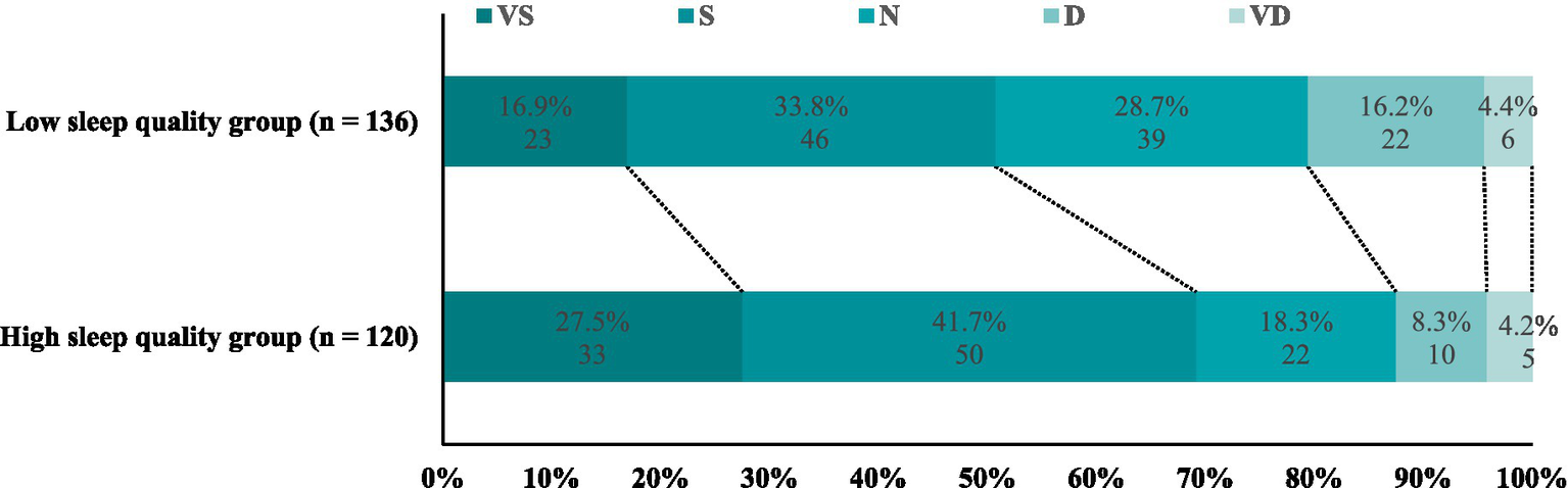 As shown in Figure 5, there is a significant difference in the distribution of Likert-scale satisfaction between the two groups. In the HSQG, 27.5% of the patients expressed “very satisfied,” and 41.7% expressed “satisfied”; while in the LSQG, the corresponding proportions were only 16.9 and 33.8%. The proportion of “unsatisfied” in the HSQG was 8.3%, significantly lower than 16.2% in the LSQG. The difference in Likert scale distribution between the two groups was statistically significant (χ2 = 10.32, p = 0.03). The results indicate that the higher the preoperative sleep quality, the higher the satisfaction during hospitalization, which may promote rapid postoperative recovery.