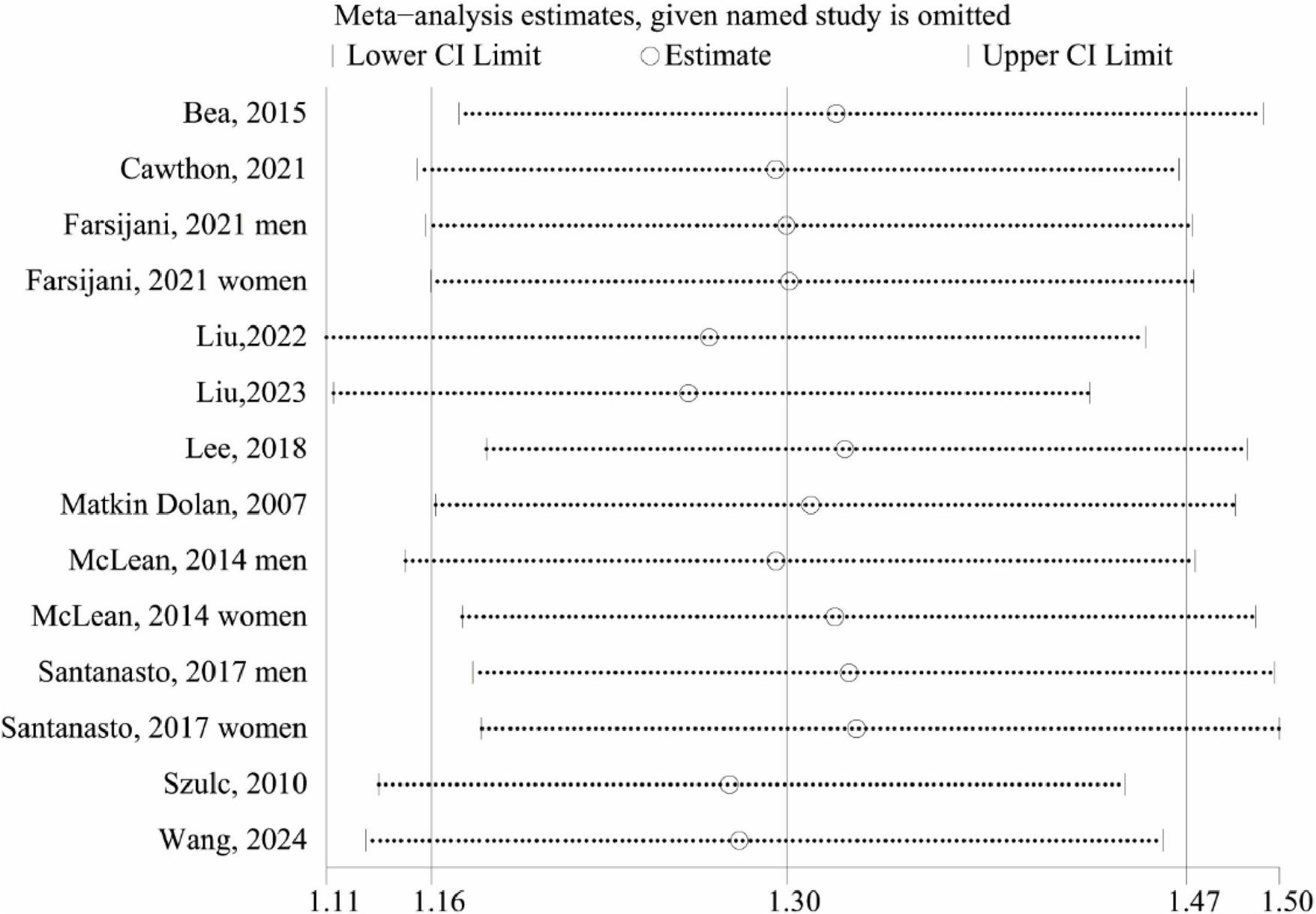 To investigate potential sources of between-study heterogeneity, subgroup analyses were carried out. These analyses focused on factors such as age at baseline, gender, BMI at baseline, location of study, duration of follow-up, number of participants, method used for assessment of lean mass, study quality, and indicators reported for lean mass. Additionally, we conducted a meta-regression model analysis based on participants’ age, follow-up time, region, gender, and sample size.