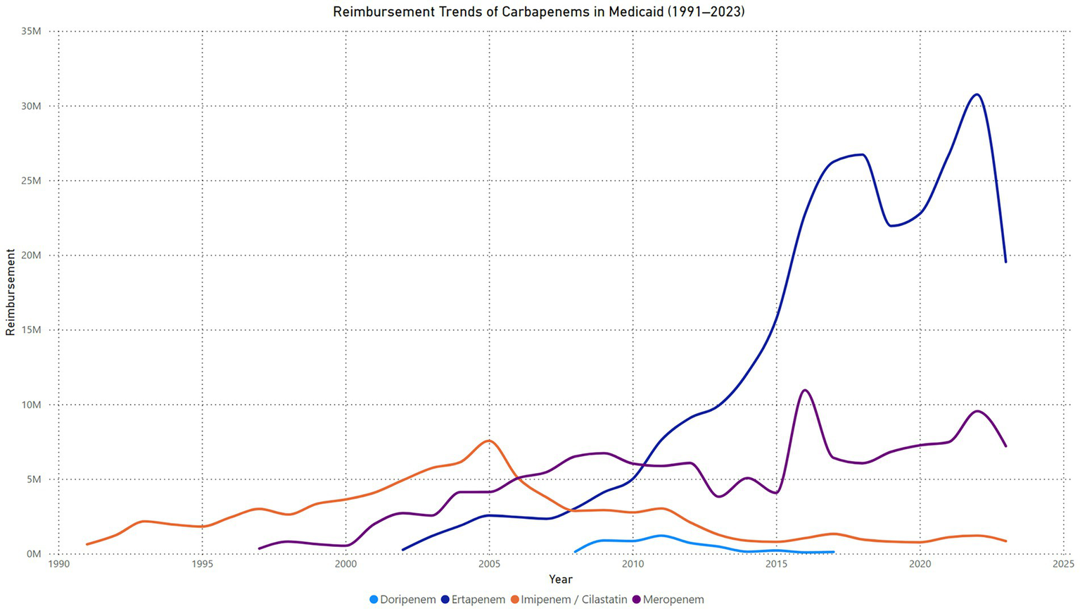 The reimbursement trends for carbapenems in Medicaid from 1991 to 2023 highlight distinct patterns across the four agents. Imipenem/cilastatin showed a peak reimbursement of $7,555,204 in 2005, followed by a steady decline to $839,581 in 2023, reflecting its reduced clinical preference over time. Meropenem experienced a gradual increase in reimbursements, peaking at $10,948,523 in 2016, with fluctuations in subsequent years and a reimbursement of $7,198,477 in 2023, indicating sustained but moderated use. Ertapenem, introduced in 2002, exhibited the most substantial growth, surpassing all other carbapenems by 2016 and peaking at $30,749,447 in 2022. While reimbursements declined to $19,530,233 in 2023, ertapenem remains the most reimbursed carbapenem, highlighting its widespread clinical adoption. Conversely, doripenem, introduced in 2008, consistently showed the lowest reimbursements, peaking at $1,204,343 in 2011 and declining to negligible levels in recent years, reflecting its limited market impact.