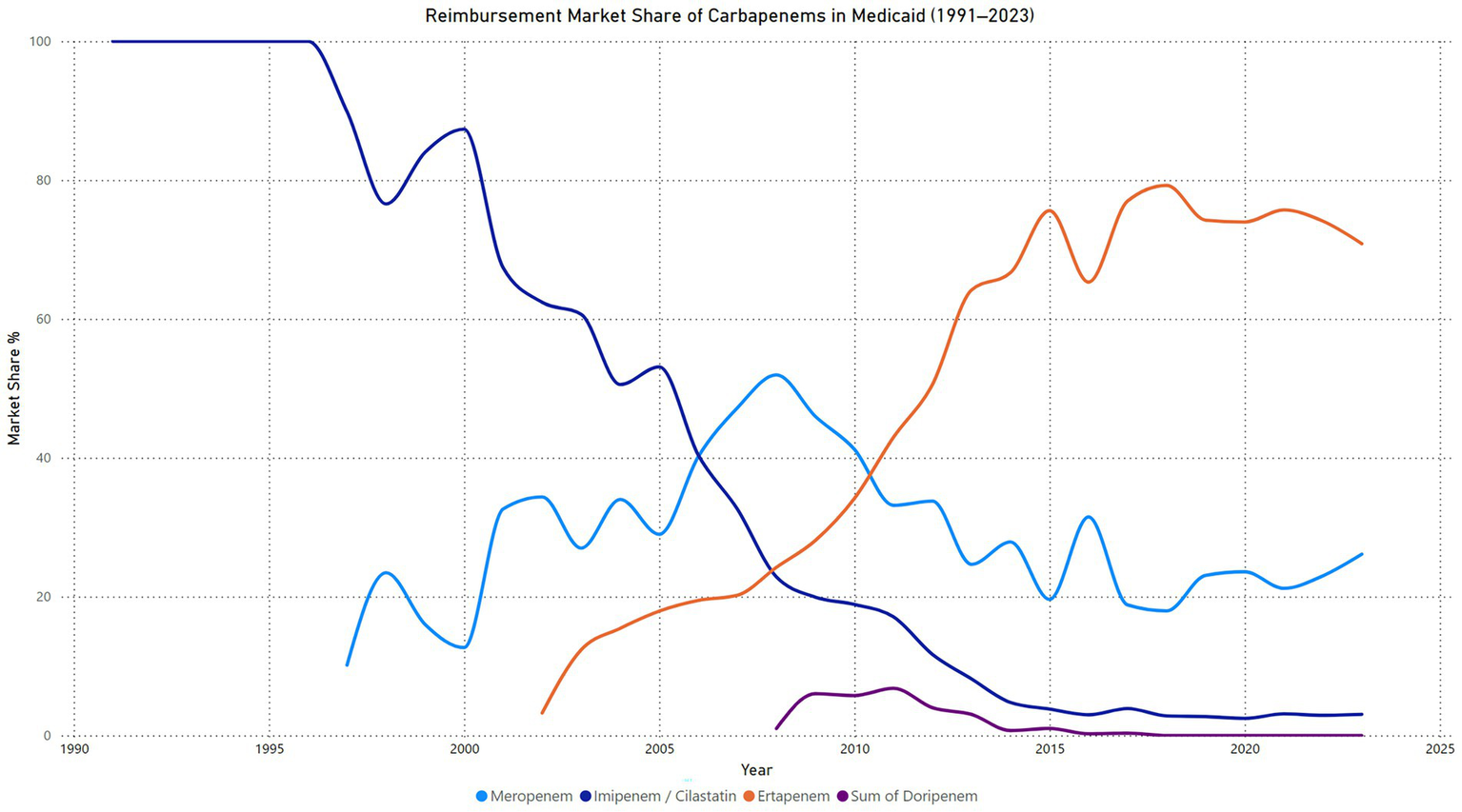 Imipenem/cilastatin, the first carbapenem introduced, initially dominated the market, maintaining a 100% market share until 1996. However, its utilization and reimbursement steadily declined following the introduction of newer carbapenems, particularly meropenem and ertapenem. This trend aligns with the broader adoption of alternative agents and evolving clinical guidelines favoring more targeted therapies to mitigate antimicrobial resistance (11–16). The decline in Imipenem/cilastatin prescriptions post-2005 can be attributed to safety concerns and the introduction of newer carbapenems with more favorable dosing profiles. Studies have indicated that imipenem, especially at higher doses, carries a risk of neurotoxicity, including seizures, particularly in patients with renal impairment (17). Comparative studies have demonstrated that meropenem is associated with a lower incidence of Adverse Effects (AEs) compared to imipenem/cilastatin. Specifically, research indicates that nausea and vomiting occur less frequently with meropenem. For instance, a review in Mayo Clinic Proceedings reported that in comparative trials, meropenem had lower rates of serious AEs compared to imipenem/cilastatin (18, 19). Additionally, a study published in Critical Care found no drug-related nausea and vomiting in patients treated with meropenem, whereas one drug-related seizure was reported in the imipenem/cilastatin group. These findings suggest that meropenem has a more favorable safety profile, particularly concerning gastrointestinal and neurological adverse effects (20, 21). Furthermore, the therapeutic margin is narrower with Imipenem/cilastatin, limiting its dosing flexibility. This limitation has led clinicians to prefer newer carbapenems that offer more straightforward dosing regimens and improved safety profiles (17). These factors have collectively influenced a shift in clinical practice, favoring the use of newer carbapenems over Imipenem/cilastatin in the years following 2005. Imipenem/cilastatin was first approved in 1985, meropenem in 1996, ertapenem in 2001, and doripenem in 2007. These approval dates align with the observed shifts in market share, particularly the initial dominance of imipenem/cilastatin and the rapid rise of ertapenem and meropenem in subsequent years.