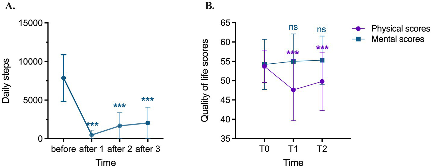Step count data were collected from 244 patients who underwent minimally invasive surgery for lung cancer using Mi Band 5 to track preoperative and 3-day postoperative activity. Patients’ quality of life was assessed using the 12-Item Short Form Health Survey (SF-12) preoperatively and at 1 and 3 months postoperatively. Correlation and regression analyses were conducted to evaluate the impact of perioperative step count on hospital length of stay and quality of life.