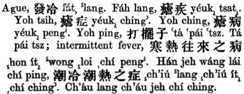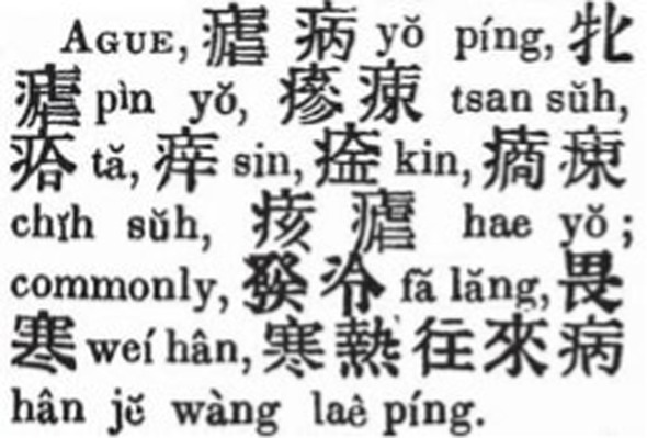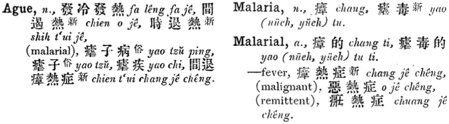 Since then, “ague” and “malaria,” as two separate entries having completely different translations, coexisted in English-Chinese dictionaries for over 40 years. The equivalents of “ague” mainly denoted the symptoms of the disease, or contained the character “nue 瘧/疟,” whereas the equivalents of “malaria” mainly contained the character “zhang 瘴.” For instance, in Vocabulary and Hand-book of the Chinese Language compiled by Doolittle (1872), “ague” was translated into “faleng,” “nuebing,” “fanuezi 發瘧子/发疟子,” and “hanre wanglai bing 寒熱往來病/寒热往来病,” while “malaria” was translated into “shanlan zhangqi 山嵐瘴氣/山岚瘴气” and “fudu zhiqi 腐毒之氣/腐毒之气” (28). The first and fourth equivalents of “ague” denoted the symptoms, and second and third contained “nue”; the first equivalent of “malaria” contained “zhang,” and both explained the concept as pathogenic qi that causes diseases.