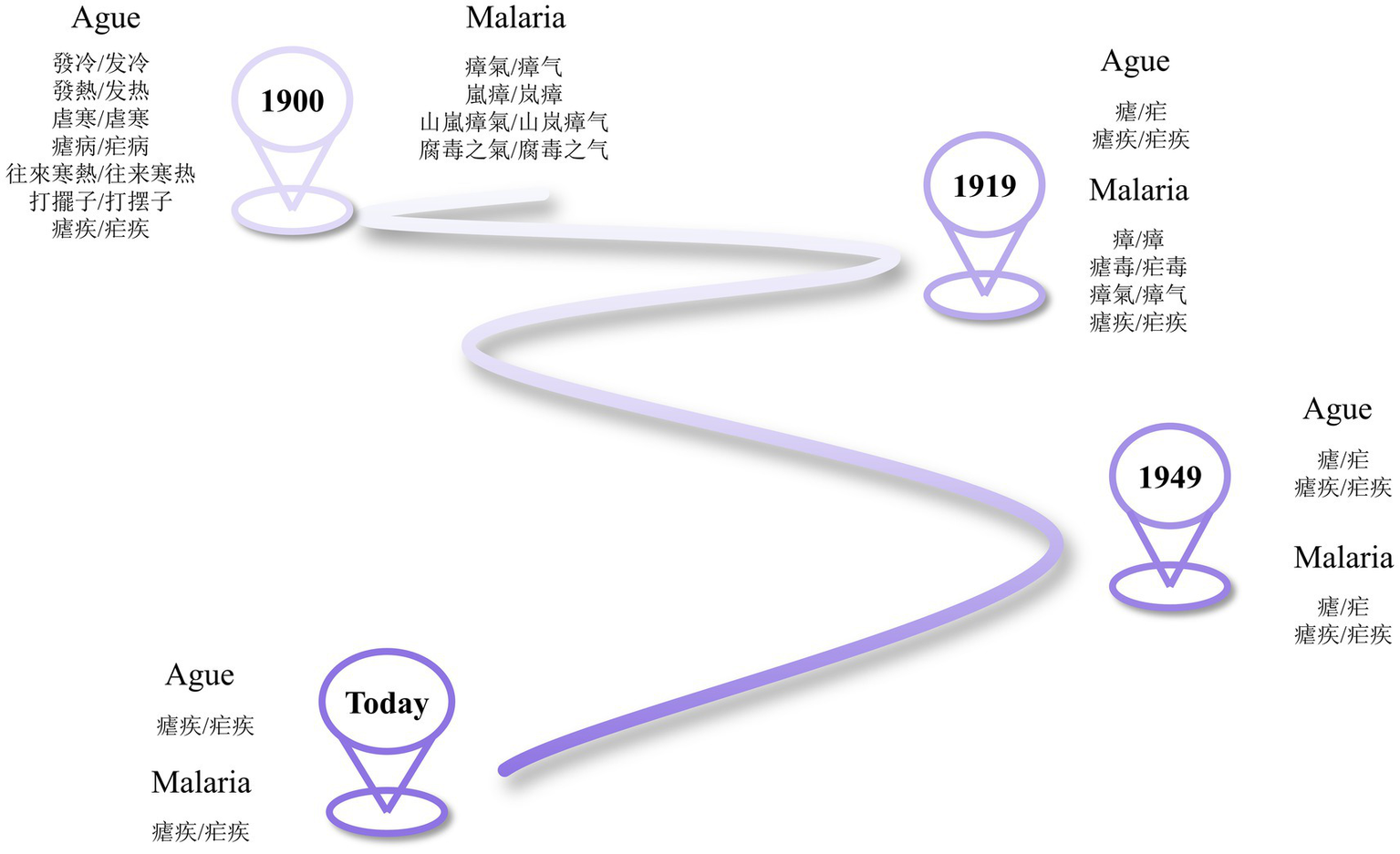 In the Western medical tradition, malaria had multiple synonyms - ague, paludisme, Wechselfieber, Dardag Kolle, triasuchka, accessia, marsh fever, Lord John’s fever, among many others (17). Similarly, in Traditional Chinese Medicine (TCM), malaria was referred to by diverse terms, including shiyi (濕疫/湿疫), wenshiji (溫濕疾/温湿疾), zhangqi (瘴氣/瘴气), zhangli (瘴癘/瘴疬), guinue (鬼瘧/鬼疟), and zhangnue (瘴瘧/瘴疟), as was summarized by Fan Xingzhun (範行准/范行准) (22).