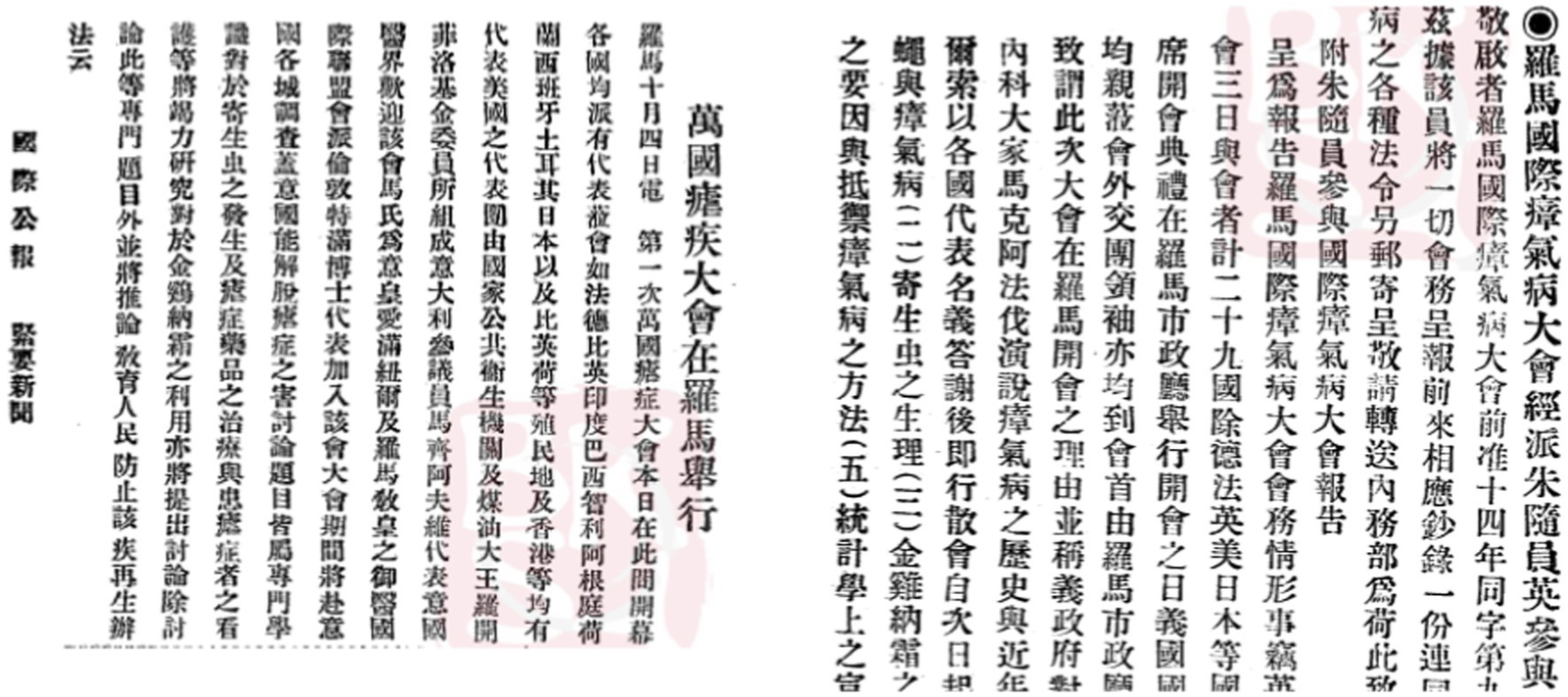 Dictionary proofs manifested that the equivalents of “ague” and “malaria” became unified in the 1940s, and such unification could be observed through the convergence of “nueji” and “zhangqi” as translated terms. The modern newspaper and periodical proofs further showed that the relation between “nueji” and “zhangqi” was clarified around 1935. Around 1924, a malarial epidemic attacked Union of Soviet Socialist Republics. Facing its spread, the First International Congress for Malaria was held in Rome, the news on which spread quickly in China through newspaper articles. The congress was denoted by different names, “wanguo nueji dahui” (the world nueji congress 萬國瘧疾大會/万国疟疾大会) and “luomaguo zhangqibing dahui” (the international zhangqibing congress in Rome 羅馬國際瘴氣病大會/罗马国瘴气病大会), in articles published in The International Journal and Institute Record (國際剬報/国际剬报) and Waijiao Gongbao (diplomatic journal 外交剬報/外交剬报), demonstrating the fact that the Chinese translation of “malaria” had not been unified (Figure 9).