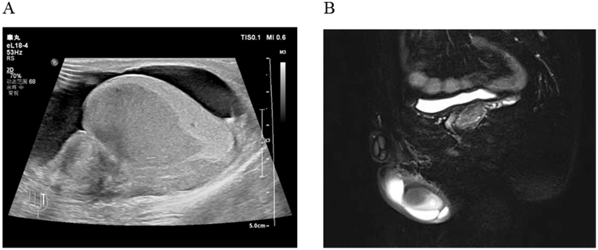 A 35-year-old man was admitted to Department of Urology on April 27, 2024, due to the discovery of a nodule behind the left testicle for 6 months, accompanied by pain for 2 days. Ultrasound shows a hypoechoic area in the left testicle, further examination is recommended. Enlarged left epididymis with abundant blood supply. There is a large amount of fluid accumulation in the left testicular sheath cavity (Figure 1A). Magnetic resonance imaging (MR) shows patchy abnormal signals in the left epididymis and testes, suggesting the possibility of infectious lesions; Bilateral testicular hydrocele (Figure 1B). He had a 10-year history of smoking (approximately 20 cigarettes per day) and no known family history of cancer, genetic diseases, or a history of long-term medication use. Additionally, there was no evidence of current or previous soft tissue tumors or history of radiation exposure.