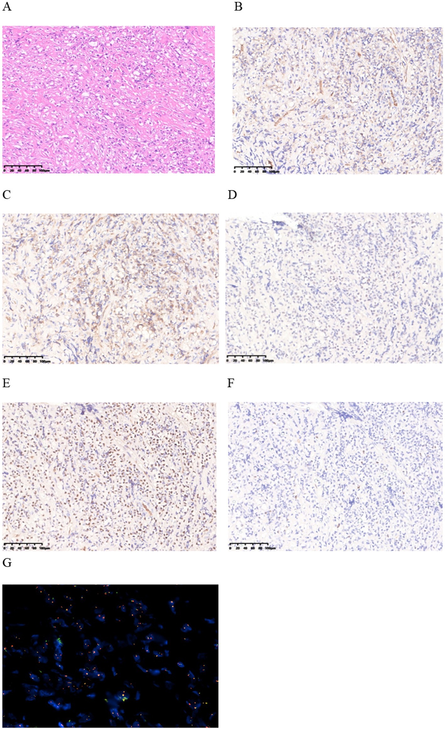 Figure 2. (A) HE staining finding at 20x magnification. (B–E) Immunohistochemical staining shows positive staining for CD31, CD34, Fli-1, and ERG in the lesion. (F) Immunohistochemical staining for Ki-67 shows a low proliferation index with 5% positivity. (G) FISH revealed fusion of WWTR1-CAMTA1 gene.
