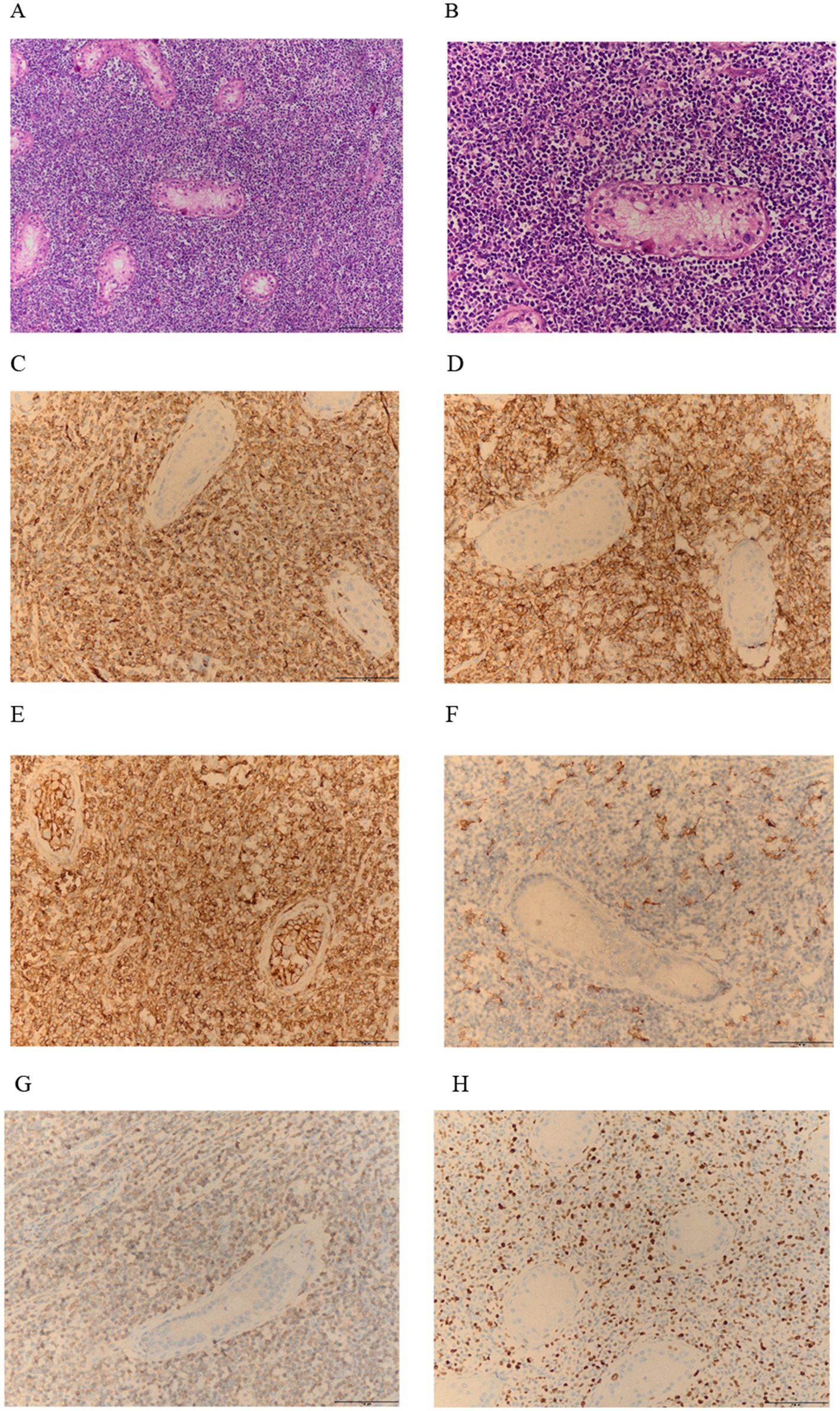 Figure 3. (A,B) HE staining shows numerous atypical cells: at 10x and 20x magnification. (C–G) Immunohistochemistry indicates that CD31, CD43, CD99, and MPO are positively expressed within the lesion (C–E,G); CD163 is positive in small areas (F); (H) The Ki-67 proliferation index is high, with a positivity rate of 50%.