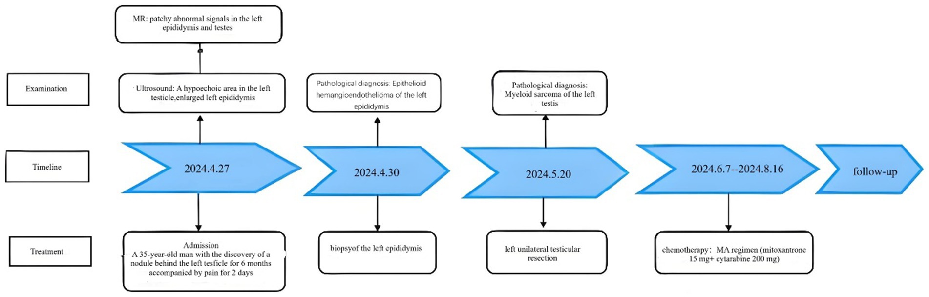 Two weeks later, the patient was readmitted for left unilateral testicular resection after excluding contraindications. Under the light microscope, tumor cells in the testes are diffusely arranged. The tumor cells are medium-sized or slightly large, round or oval in shape, with less cytoplasm and delicate nuclear chromatin. Small nucleoli can be seen, and nuclear division is easy to observe (Figures 3A,B). IHC analysis of the testicular tumor further revealed CK(−), vimentin(−), CD31(+), CD34(+), CD43(+), MPO(+), LCA(+), CD99(+), CD117(+), CD163(foci +), P53(>80%+), CD3(−), CD5(−), CD20(−), CD19(−), PAX5(−), Ki-67(+50%+) (Figures 3C–H), FISH did not detect the fusion of WWTR1-CAMTA1 gene. Pathological biopsy diagnosis is myeloid sarcoma. Pathological examination of blood cells showed no significant abnormalities, flow cytometry showed that primitive granulocytes accounted for 0.31%, and bone marrow cell examination showed active bone marrow proliferation. Therefore, the final diagnosis is primary MS of the testicle combined with ipsilateral epididymal EHE. The patient received one cycle of MA chemotherapy (mitoxantrone 15 mg + cytarabine 200 mg), followed by two high-dose cytarabine cycles (3 g every 12 h). At the same time, targeted supportive treatments were provided. Later, the patient’s condition stabilized, and he was discharged from the hospital and underwent regular follow–up (Figure 4). Since discharge, the patient has undergone regular follow-up for 9 months. Periodic flow cytometry, bone marrow cell examination, and pathological morphology analysis of blood cells have revealed no evidence of progression to AML. Chemotherapy-induced myelosuppression was treated with granulocyte colony-stimulating factor for leukocytosis and thrombopoietin for thrombocytopenia, and the condition has remained stable.